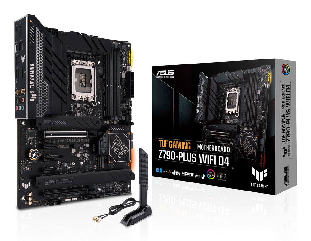 Intel LGA 1700 Intel® Celeron®, Intel® Core™ i3, Intel® Core™ i5, Intel® Core™ i7, Intel® Core™ i9, Intel® Pentium® Gold. PC ATX Intel Z790 Realtek S1220A 7.1 channels. DDR4-SDRAM 4 DIMM Maximum internal memory: 128 GB. HDD & SSD M.2, SATA III RAID support. BIOS type: UEFI AMI 192 Mbit Clear CMOS button. 2.5 Gigabit Ethernet Wi-Fi Wi-Fi 6 (802.11ax) Bluetooth 5.2. TUF GAMING Z790-PLUS WIFI D4 takes all the essential elements of the latest Intel® processors and combines them with game-ready features and proven durability. Engineered with military-grade components, an upgraded power solution and a comprehensive cooling system, this motherboard goes beyond expectations with rock-solid performance for marathon gaming. TUF GAMING motherboards also undergo rigorous endurance testing to ensure that they can handle conditions where others may fail. Aesthetically, this model incorporates an embossed nameplate and honeycomb design elements to reflect the dependability and stability that defines the TUF GAMING series.. INTELLIGENT CONTROL. The TUF GAMING Z790 motherboards pack flexible tools to tune every aspect of your system, enabling performance tweaks to expertly match the way you play.. AI Cooling II. Balance the thermals and acoustics of any build with a single click. An ASUS-exclusive algorithm slashes unnecessary noise while running a quick stress test, and then it monitors CPU temperatures to dynamically adjust fans to optimal speeds.. All-Around Energy Efficiency. The Power Saving function contains several settings that can easily optimize power consumption and maximize energy savings. You can enable a CPU power limit, darken Aura lighting, and set the fan profile to a power saving mode. You can also toggle the Power Saver plan that is built into Microsoft Windows.. UEFI BIOS. The renowned ASUS UEFI BIOS provides everything you need to configure, tweak and tune your system. It offers intelligently simplified options for PC DIY beginners and comprehensive features for seasoned veterans.. Armoury Crate. The ASUS-exclusive Armoury Crate software centralizes control of all supported gaming products. A single intuitive interface lets you customize RGB lighting for all compatible devices and link them to Aura Sync for unified illumination. It also displays information from, and enables control of, a growing hardware ecosystem. Armoury Crate also enables easy product registration and features a news section to keep you in touch with the gaming community.. ROCK-SOLID PERFORMANCE. With upgraded power delivery and comprehensive cooling options to fuel the latest Intel CPUs, plus support for DDR4 memory and PCIe 4.0 storage, the TUF GAMING Z790-PLUS WIFI D4 is the perfect foundation for your next Intel battle rig.. DrMOS Power Stages. 16+1 power stages are each rated to handle 60 amperes, combining high-side and low-side MOSFETS and drivers into a single package to deliver power, efficiency and stable performance for all compatible Intel processors.. Six-Layer PCB Design. The multi-layered printed circuit board design quickly dissipates heat around the voltage regulators to improve overall system stability and provide the CPU with more overclocking headroom.. 8+4 Pin ProCool Power Connectors. Compared to most power inputs, ASUS ProCool connectors are built to tight specifications to ensure full contact with PSU power cables. The resulting lower impedance helps prevent hotspots and connector failure.. TUF Components. TUF Chokes. Certified military-grade TUF chokes deliver rock-solid power to the CPU, improving system stability.. TUF Capacitors. The TUF 5K black metallic capacitors provide 52% wider temperature tolerance and a 2.5X-longer lifespan than standard motherboard capacitors.. Digi+ VRM. The integrated Digi+ voltage-regulator module (VRM) is one of the finest in the industry, optimized for ultra-smooth and ultra-clean power delivery to the CPU at all times.. DRAM Overclocking Performance. DDR4 OC 5333. Improvements to trace routing design provide the latest Intel processors with enhanced access to memory bandwidth. ASUS OptiMem II technology carefully maps memory signal pathways across different PCB layers to reduce path distance, and it adds shielding zones that significantly reduce crosstalk.. PCIe 4.0 Support. The four PCIe 4.0 M.2 slots support up to two 22110 devices and also provide NVMe SSD RAID support for incredible performance potential. Create a RAID configuration with up to four PCIe 4.0 storage devices to enjoy the fastest data transfer speeds.. Cooler By Design. The TUF GAMING Z790-PLUS WIFI D4 is armed with an enlarged VRM heatsink, while three M.2 slots and the PCH feature heatsinks that provide the perfect balance of mass and surface area for heat dissipation.. Comprehensive Fan Controls. TUF GAMING Z790 motherboards feature comprehensive fan controls that can be configured via the Fan Xpert 4 utility in Armoury Crate or via the award-winning ASUS UEFI BIOS.. Connectivity. The TUF-GAMING Z790-PLUS WIFI D4 reaches new heights of performance potential with the latest version of PCI Express, while an arsenal of USB ports includes three Type-C connections, and Thunderbolt 4 expands compatibility and bandwidth even further.. EASY PC DIY. The TUF GAMING line offers easy setup for all builders. The TUF GAMING Alliance ecosystem grants compatibility, while Armoury Crate has Fan Xpert 4, hardware info, Two-Way AI Noise Cancelation, RGB options and peripheral settings. This platform has intuitive tools to build and optimize dream rigs.. Build With Confidence. TUF GAMING Alliance is a collaboration between ASUS and trusted PC component brands to ensure compatibility across a wide range of parts, such as PC cases, power supplies, CPU coolers, memory kits and more. With new partnerships and components being added regularly, the TUF GAMING Alliance will continue to grow even stronger.. SafeSlot & SafeDIMM. SafeSlot is a reinforced metal sheath added to a PCIe slot to keep 