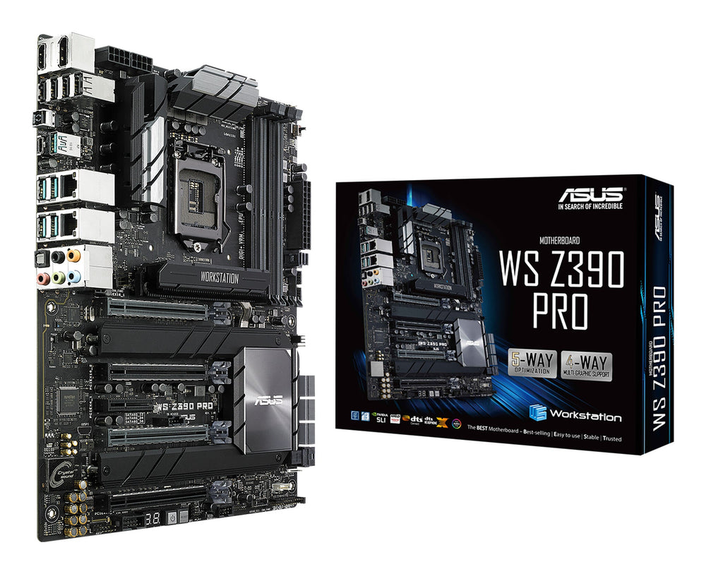 Quad-GPU supports: Fits up to four dual-slot graphics cards and supports NVIDIA SLI or AMD CrossFireX GPU configurations. AI overclocking: Quickly optimizes your CPU performance based on the CPU and cooler, achieving results that are extremely close to manual tuning by experts. OptiMem II: Careful routing of traces and vias, plus ground layer optimizations to preserve signal integrity for improved memory overclocking. Enhanced power solution: Premium components provide better power efficiency. UEFI BIOS: New UEFI options include a search function that allows you to find settings easily. Industry-leading cooling options: Comprehensive controls for fans and water pump, via Fan Xpert 4 or the acclaimed UEFI. Dual M.2 heatsink: Ultra-efficient heatsink reduces M.2 SSD temperature for unthrottled transfer speeds and enhanced reliability. Ultra-fast storage: dual M.2 and U.2, plus USB 3.1 Gen 2 with Type-A and Type-C ports onboard and a front-panel connector. Designed for compute-intensive workloads, WS Z390 PRO blends tremendous GPU performance, comprehensive tuning options, and robust connectivity for prosumers and content creators.. Multi-GPU support. WS Z390 PRO fits up to four dual-slot graphics cards and supports both NVIDIA SLI and AMD CrossFireX for multi-GPU setups that harness the full power of the latest graphics technologies, delivering the best performance for design, modeling, medical research and processing-intensive simulation and rendering applications.. Tune it your way. WS Z390 PRO simplifies CPU overclocking with software and extensive tweaking options that give beginners and seasoned overclockers alike the tools to build well-tuned machines. A new memory trace layout provides stability and compatibility for both traditional DIMMs and RGB-infused memory, letting you pair a broad choice of DRAM kits with your build.. Media-acclaimed UEFI BIOS. The UEFI BIOS is an early waypoint on any PC-building journey, and WS Z390 PRO offers one of the best in the business.. Cool and Reliable. Designed to tackle compute workloads WS Z390 PRO has enhanced power delivery for multithreaded processors and an array of controllable headers for liquid loops and air coolers.. ProCool power connector. Compared with traditional power inputs, ProCool sockets are built to tight specifications to ensure flush contact with the PSU power lines. This lowers impedance, which helps to prevent hotspots and connector failure.. Processor. Compatible processor series. Intel® Celeron®, Intel® Core™ i3, Intel® Core™ i5, Intel® Core™ i7, Intel® Pentium®. Processor socket. LGA 1151 (Socket H4). Processor manufacturer. Intel. Memory. Maximum internal memory. 64 GB. Supported memory clock speeds. 2133,2400,2666,2800,3000,3200,3300,3333,3400,3466,3600,3733,3800,3866,4000,4133,4200,4266 MHz. Memory channels. Dual-channel. Memory slots type. DIMM. Number of memory slots. 4. Supported memory types. DDR4-SDRAM. Storage controllers. RAID levels. 0, 1, 5, 10. Graphics. Number of displays supported. 3. Discrete graphics support. Yes. Maximum resolution. 4096 x 2160 pixels. Parallel processing technology support. 4-Way CrossFireX, 4-Way SLI, Quad-GPU CrossFireX, Quad-GPU SLI. Internal I/O. RGB LED pin header. Yes. Number of COM connectors. 1. TPM connector. Yes. Thunderbolt headers. 1. EPS power connector (8-pin). Yes. Number of chassis fan connectors. 3. CPU fan connector. Yes. ATX Power connector (24-pin). Yes. Front panel audio connector. Yes. Number of SATA III connectors. 6. USB 3.2 Gen 2 (3.1 Gen 2) connectors. 1. USB 3.2 Gen 1 (3.1 Gen 1) connectors. 1. USB 2.0 connectors. 1. Rear panel I/O ports. S/PDIF out port. Yes. DisplayPorts quantity. 1. HDMI version. 2.0. HDMI ports quantity. 1. Ethernet LAN (RJ-45) ports. 2. USB 3.2 Gen 2 (3.1 Gen 2) Type-C ports quantity. 1. USB 3.2 Gen 2 (3.1 Gen 2) Type-A ports quantity. 5. USB 2.0 ports quantity. 4. Network. LAN controller. Intel® I210-AT, Intel I219LM. Ethernet interface type. Gigabit Ethernet. Ethernet LAN. Yes. Features. Audio output channels. 8.0 channels. Audio chip. Realtek ALC S1220A. Motherboard chipset. Intel Z390. Motherboard chipset family. Intel. Motherboard form factor. ATX. Component for. PC. Expansion slots. Number of M.2 (M) slots. 2. PCI Express x16 (Gen 3.x) slots. 4. PCI Express x4 slots. 1. BIOS. System Management BIOS (SMBIOS) version. 3.0. Plug and Play. Yes. Clear CMOS button. Yes. ACPI version. 6.0. BIOS memory size. 256 Mbit. BIOS type. UEFI. Processor special features. Intel® Optane™ Memory Ready. Yes. Intel Rapid Storage Technology. Yes. Intel Extreme Memory Profile (XMP). Yes. Logistics data. Harmonized System (HS) code. 84733020. Weight & dimensions. Depth. 244 mm. Width. 305 mm. Packaging content. Cables included. SATA. Manual. Yes. Other features. PCI Express power connectors (6-pin). 1