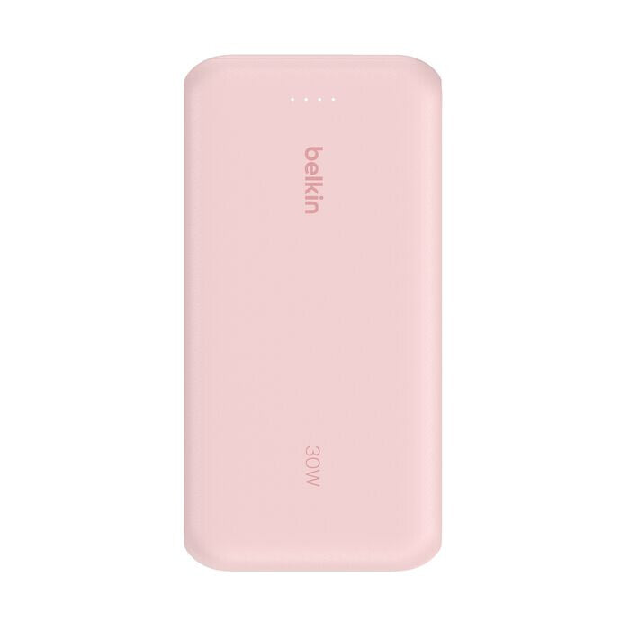 Integrated USB-C cable. PD 30W to fast charge your smartphones and tablets. 20K battery capacity provides 87 hours of playback for an iPhone 16 Pro. Charges three devices at the same time with up to 30W total output. LED shows battery status. Pass-through power allows for charging a device while the power bank recharges. Air travel friendly and TSA compliant. Charge up to 30W with our lightweight 20K§ power bank. Its integrated USB-C® cable design offers a convenient on-the-go fast charging experience without carrying a cable. A USB-C and USB-A port allows charging of a second and third device at the same time.. Design. LED indicators. Battery level. Protection features. Flame resistant, Overheating protection, Overload protection. Shape. Rectangle. Power bank & device charging at once. Yes. Charger compatibility. Universal. Product colour. Rose. Number of simultaneously connected devices (max). 3. Performance. USB Power Delivery up to. 30 W. Fast charging technology. Power Delivery. USB Power Delivery (USB PD). Yes. Fast charging. Yes. Battery capacity. 20000 mAh. Charging source. USB. Ports & interfaces. USB Type-C ports quantity. 1. USB Type-A output ports. 1. USB Type-C connector. Yes. Input interface. USB Type-C. Weight & dimensions. Cable length. 0.12 m. Height. 25.1 mm. Depth. 154 mm. Width. 76.2 mm