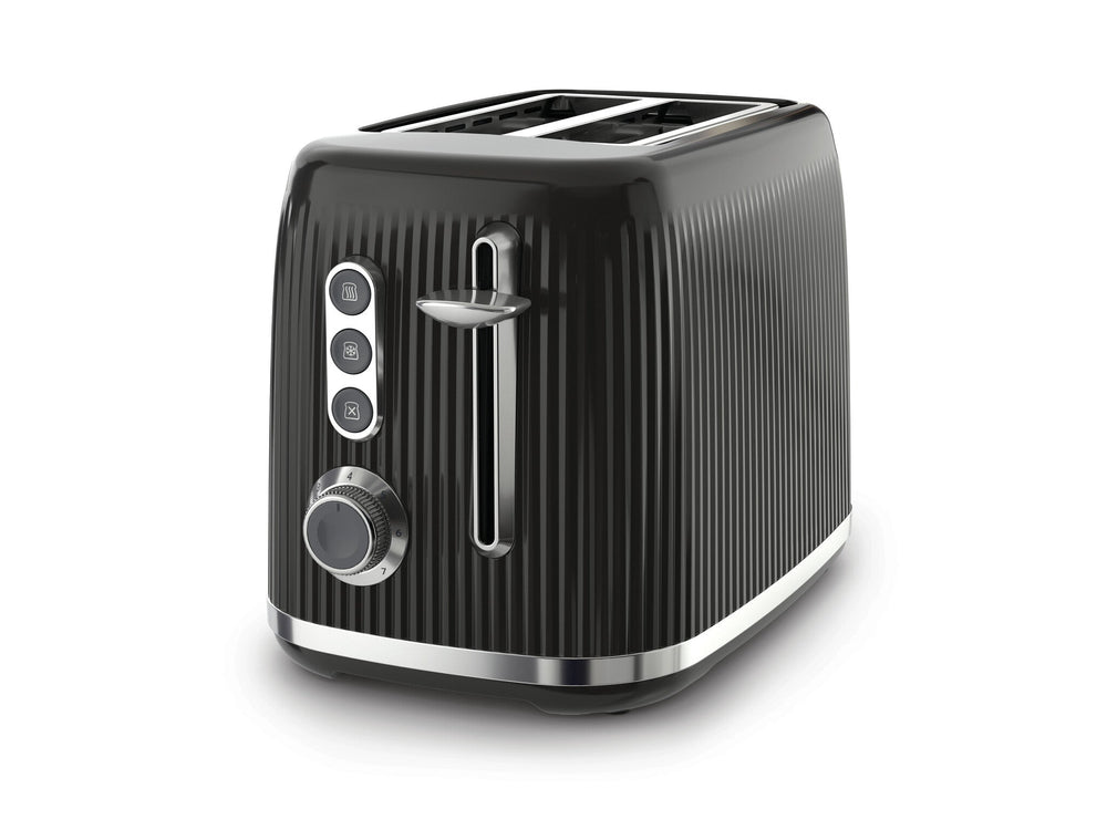 Variable width bread slots allow for both thick and thin slices. Variable browning control lets you pick your preferred shade of golden brown. Lift & Look function lets you check your toast mid-cycle; High Lift feature means smaller items can be removed easily without burning fingers. Defrost, reheat and mid-cycle cancel functions, plus removable crumb tray, non-slip base and cord storage. Complete your collection with the matching Bold kettle. Bring daring style to your kitchen with the Breville Bold Collection, featuring a glossy ridged textured finish with high shine chrome accents and illuminated controls for ease of use. This Breville toaster also handles the basics with ease. View your toast’s progress mid-cycle with Lift & Look, and remove smaller slices without burning fingers with the High Lift facility. The deep, variable width slots accommodate different bread sizes, crumpets and bagels, while the variable browning controls ensure every slice is just the way you like it. A removable crumb tray and cord storage helps keep your worktop clean and tidy.. Features. Cord storage. Yes. Stop/cancel button. Yes. High-lift mechanism. Yes. Non-slip feet. Yes. Reheat function. Yes. Defrost function. Yes. Removable crumb tray. Yes. Auto pop-up mechanism. Yes. Number of slots. 2. Extra wide slot. Yes. Electronic browning control. Yes. Housing material. Plastic. Product colour. Black. Number of slices. 2 slice(s). Power. Power. 900 W. Weight & dimensions. Weight. 1.03 kg. Height. 193 mm. Depth. 173 mm. Width. 285 mm. Packaging data. Package weight. 1.3 kg. Package height. 156 mm. Package depth. 214 mm. Package width. 330 mm