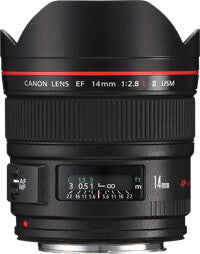 The exacting professional's ultra wide-angle lens, the EF 14mm f/2.8L II USM uses UD and aspherical elements for paramount image quality. A maximum f/2.8 aperture ensures great low light performance.. - L-series construction with dust and moisture sealing.. - Large f/2.8 aperture.. - Aspherical and UD lens elements.. - Ring USM auto focus with full-time manual focus override.. - Circular aperture.. - Super Spectra coatings reduce ghosting and flare.. Lens system. Lens viewing angle, diagonal. 114°. Lens structure (elements/groups). 14/10. Design. Product colour. Black. Weight & dimensions. Length. 89 mm. Diameter. 7.7 cm