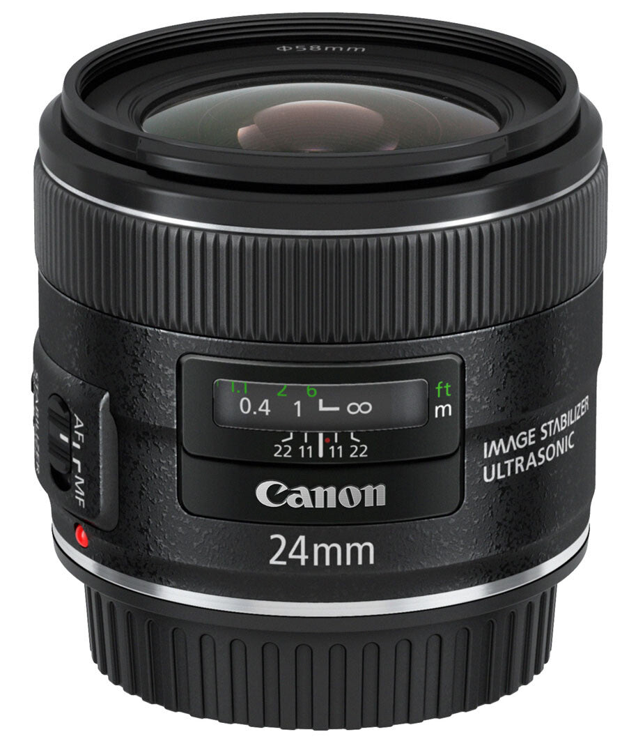 Component for: MILC Wide lens. Lens structure (elements/groups): 11/9. Maximum aperture number: 22. Closest focusing distance: 0.20 m. A 24mm wide-angle prime lens with an 84° angle of view on full-frame DSLRs – perfect for landscape photographers. On EOS cameras featuring APS-C sized sensors, the Canon EF 24mm f/2.8 IS USM gives an angle of view equivalent to a 38mm lens on a full-frame camera, making it a useful alternative to a standard lens.. Shoot in low-light conditions. A maximum aperture of f/2.8 permits hand-held photography in available light without flash. Image stabilisation allows shutter speeds up to four stops slower than usual to be used without the risk of camera shake.. Fast, quiet autofocus. An ultrasonic autofocus motor (USM) provides fast, near-silent focusing. Full-time manual focus override allows fine adjustment without changing focus modes.. Close focusing. Get near to your subject, with a close-focus distance of just 0.2m, and enjoy a dramatic wide-angle perspective.. Space- saving design. Weighing in at just 280g and measuring 68.4mm x 55.7mm, the Canon EF 24mm f/2.8 IS USM is a lens you can take everywhere. Great for reportage and travel photography.. Designed for great image quality. A seven-bladed circular aperture provides beautiful bokeh, while Super Spectra coatings reduce flare. The Canon EF 24mm f/2.8 IS USM’s classic prime-lens design minimises distortion and aberrations, which can degrade image quality.. Area of use. A portable wide-angle prime lens suited to applications in reportage, landscape and travel photography.. Lens system. Image stabilizer number of stops. 4. Image stabilizer. Yes. Closest focusing distance. 0.20 m. Maximum aperture number. 22. Number of diaphragm blades. 7. Lens mount interface. Canon EF. Fixed focal length. 24 mm. Lens type. Wide lens. Lens structure (elements/groups). 11/9. Component for. MILC. Performance. Maximum magnification. 0.23x. AF actuator. USM. Camera brands compatibility. Canon. Weight & dimensions. Weight. 280 g. Length. 55.7 mm. Filter size. 58 mm. Diameter. 6.84 cm