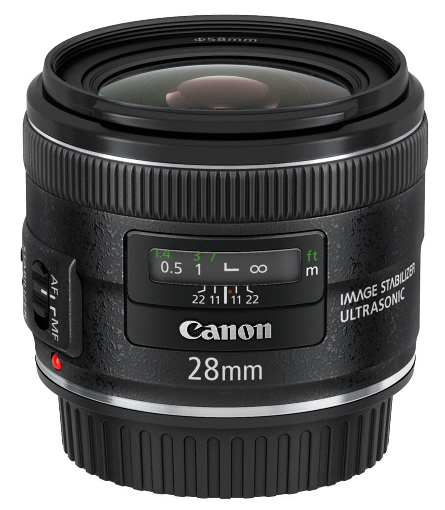 Component for: SLR Wide lens Black. Lens structure (elements/groups): 9/7. Closest focusing distance: 0.23 m. High-quality wide-angle lens. A 28mm wide-angle prime lens offering an 75° angle of view on full-frame DSLRs. On EOS cameras with APS-C sized sensors it makes a great standard lens, offering the equivalent view to a 45mm lens on a full-frame camera.. Shoot in low-light conditions. A maximum aperture of f/2.8 permits hand-held photography in available light without the use of flash. Image stabilisation allows shutter speeds up to four stops slower than normal to be used without the risk of camera shake.. Fast, quiet autofocus. Canon’s ultrasonic autofocus motor (USM) provides fast, near-silent focusing. Full-time manual-focus override permits fine adjustment without changing focus modes.. Close focusing. Get as near to your subject as 0.23m, and enjoy a dramatic wide-angle perspective.. Space- saving design. Weighing just 260g and measuring 68.4mm x 51.5mm in size, the EF 28mm f/2.8 IS USM is a lens you can take everywhere. Great for travel, landscape and documentary photography.. Designed for great image quality. A seven-bladed circular aperture provides beautiful bokeh, while Super Spectra coatings reduce flare. The EF 28mm f/2.8 IS USM classic prime-lens design minimises distortion and aberrations, which can degrade image quality.. Area of use. Perfect for landscape and travel photography and reportage applications, when a wide-angle field of view enables dramatic close-up shooting.. Lens system. Minimum aperture number. 2.8. Closest focusing distance. 0.23 m. Fixed focal length. 28 mm. Lens type. Wide lens. Lens structure (elements/groups). 9/7. Component for. SLR. Design. Product colour. Black. Weight & dimensions. Weight. 260 g. Length. 51.5 mm. Filter size. 58 mm. Diameter. 6.84 cm