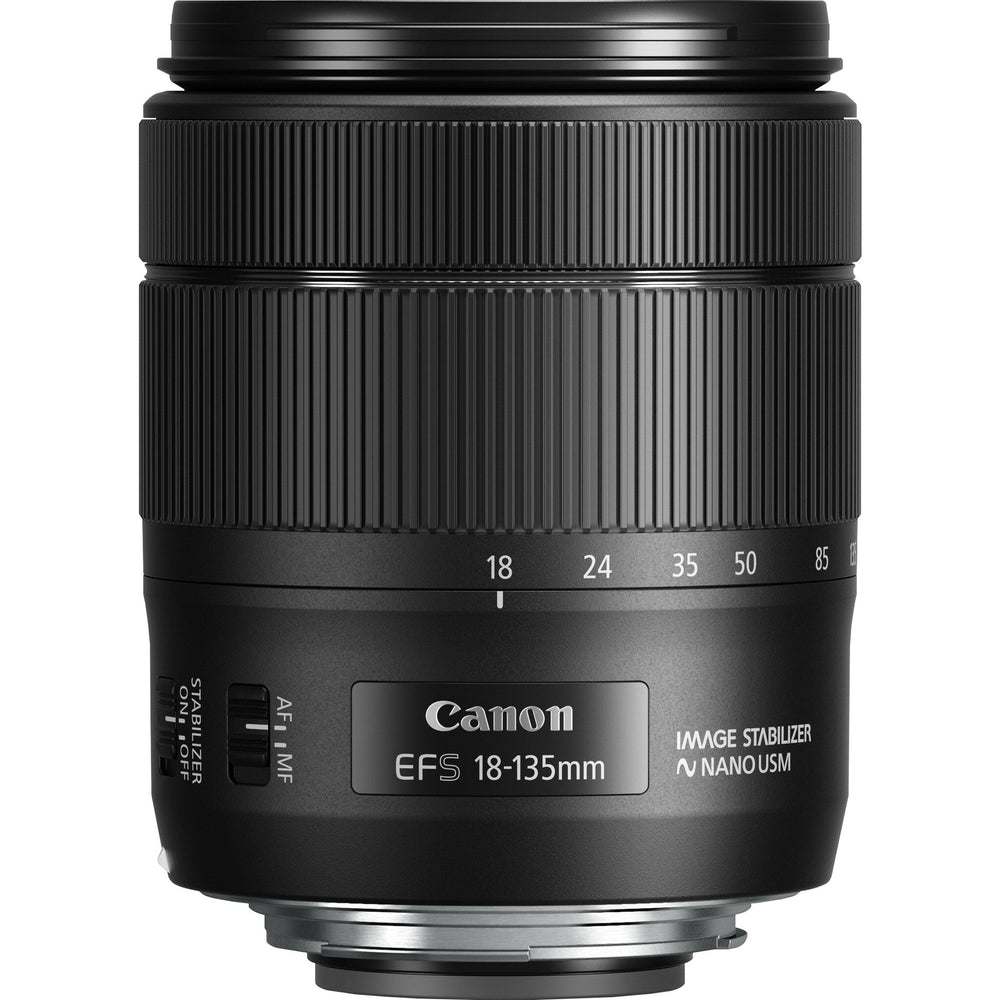Shoot a wide range of subjects in stills or movies with the wide focal range. Provide a natural look to your movies with exceptionally smooth Auto Focus when tracking subjects with Nano USM focusing technology. Travel with this kit-bag essential lens thanks to its compact and lightweight design. Suited to shooting both stills and movies using shoot-specific IS modes. Capture sharp images even in low light or shooting handheld with 4-stop Optical Image Stabilizer. Follow a moving subject with automatic Panning Mode. Combat ghosting and flare with Super Spectra lens coatings. Compatible with all Canon EOS DSLR cameras with an APS-C sensor and Canon EOS M series mirrorless cameras using the EF-EOS M Mount Adapter. From landscapes to portraits and action-packed moments, capture it all in vivid detail with this versatile EF-S 18-135mm wide-angle zoom lens. Due to its wide focal range and compact, lightweight design this lens is ideal for travel or outdoor action, delivering speed and smooth focus for impulsive stills and movies. With Nano USM technology you can focus on your subject with outstanding speed, combined with a versatile focal range it enables you to capture dramatic landscapes, beautiful portraits and fast-paced action - with 4-stop Optical Image Stabilizer to counter-act camera shake to capture sharp, high-quality images even in low light or when using zoom.. Lens system. Image stabilizer. Yes. Minimum aperture number. 22. Maximum aperture number. 38. Lens mount interface. Canon EF-S. Focal length range. 18 - 135 mm. Lens viewing angle, diagonal. 74 - 6°. Lens type. Wide zoom lens. Lens structure (elements/groups). 16/12. Component for. SLR. Performance. Ultrasonic motor (USM). Yes. Camera brands compatibility. Canon. Design. Product colour. Black. Logistics data. Harmonized System (HS) code. 90021100. Weight & dimensions. Weight. 515 g. Length. 96 mm. Filter size. 67 mm. Diameter. 7.74 cm