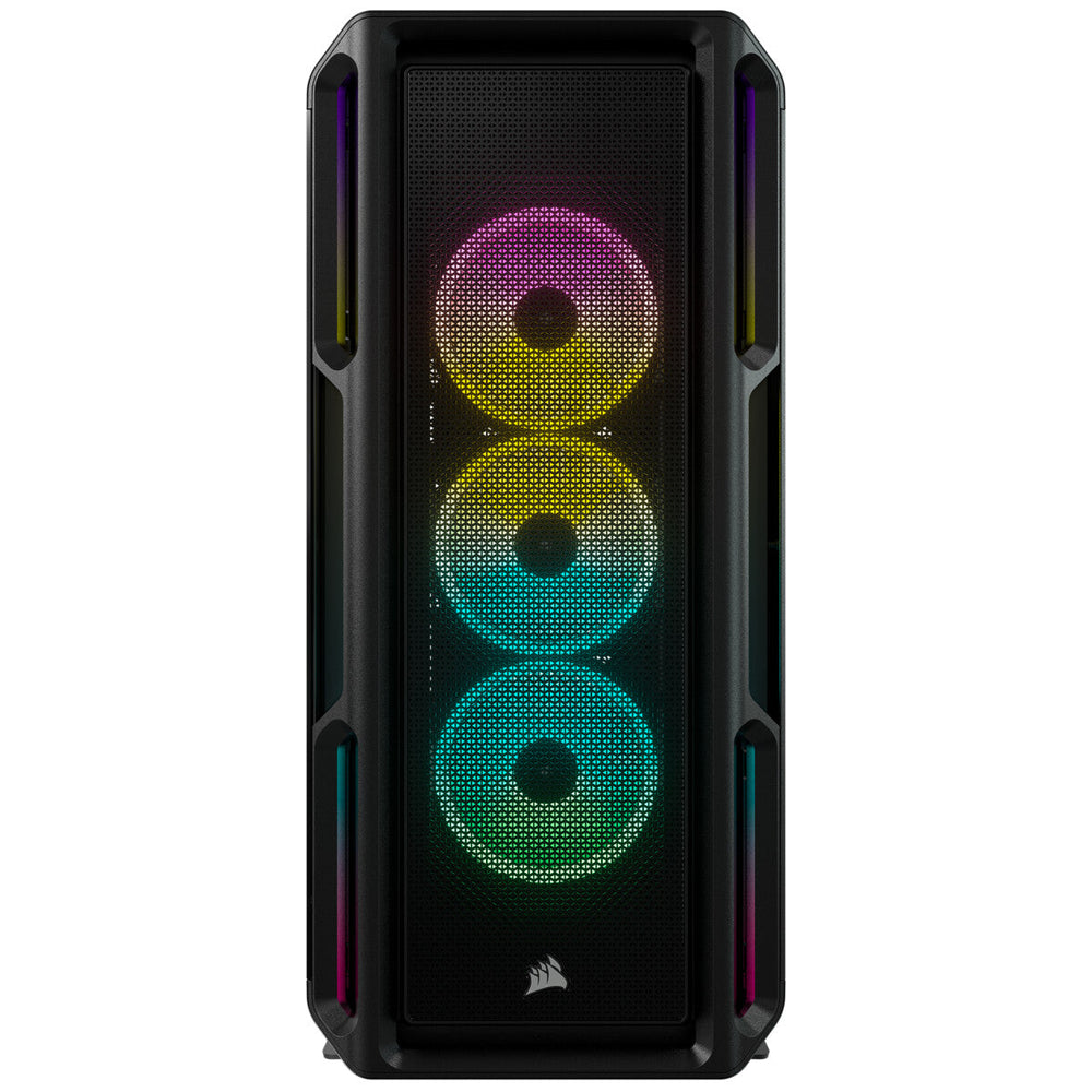 Midi Tower PC Home/Office. ATX. Supported HDD sizes: 2.5,3.5". Number of 2.5" bays: 4 Number of 3.5" bays: 2. Side window Illumination Blue, Green, Red Tempered glass panel(s). Black. AVAILABLE IN BLACK AND WHITE. MAKE A LASTING IMPRESSION. Turn heads with the 5000T RGB’s unique style and design. The distinctive contours and angular accents, complemented by extensive integrated RGB lighting, offer an aesthetic that no other case can match.. TOTAL OF 208 LEDS. A LIGHT SHOW AT EVERY ANGLE. With 160 RGB LEDs integrated into the front, roof, and floor panels, plus 48 individually addressable LEDs in the included fans*, you’ll never experience a dull moment as you immerse yourself in amazing multi-zone lighting.. MAXIMUM COOLING POTENTIAL. A spacious interior fits up to 10x 120mm or 4x 140mm cooling fans, along with a 360mm radiator with fans up to 60mm-thick in the front or side position, and a 360mm radiator with fans up to 85mm-thick in the roof position.. The expansion-friendly 5000T RGB has room for extensive air or liquid-cooled configurations.. Fan mounts feature wider cutouts, allowing fan placement customization and flexibility.. Install one 360mm radiator in the roof position and one additional 360mm radiator in the front or side position.. BUILDS MADE EASY. RENOWNED BUILDER-FRIENDLY FEATURES OF THE 5000 SERIES. REMOVABLE AIRFLOW PANELS. Mesh front and roof panels are optimized for high airflow and removable for easy maintenance.. TOOL-FREE HINGED SIDE PANELS. Enjoy easy access to your system with a hinged tempered glass panel to show off your components and lighting, and a back side hinged steel panel.. RAPIDROUTE CABLE MANAGEMENT SYSTEM. Makes it simple and fast to route your major cables through a single hidden channel, with a roomy 30mm of space behind the motherboard for all your cables.. FEATURE PROFILE GREAT VERSATILITY. MODERN FRONT PANEL I/O. Puts your connections within easy reach, including a USB 3.1 Type-C port, 4x USB 3.0 ports, and a combination audio/microphone jack.. ALL THE STORAGE YOU NEED. Two combo drive trays and three SSD mounts enable multiple SSD and HDD combinations, up to 5x total 2.5in SSDs or 2x 3.5in HDDs.. CUSTOMIZABLE FAN MOUNTS. The motherboard tray with customizable fan mounts allows you to side-mount up to 3x 120mm fans or up to a 360mm radiator, enabling new flexible cooling options.. WORLD CLASS SUPPORT. Backed by CORSAIR's comprehensive 2-year warranty and world-class customer support, available to you 24/7 by phone or online, for extended peace of mind.. UNITE YOUR SETUP. CORSAIR iCUE software brings your entire setup together, creating a fully immersive ecosystem with intuitive control.. Design. Maximum PSU length. 25 cm. Maximum graphics card length. 40 cm. Maximum CPU cooler height. 17 cm. On/off button. Yes. Cable management. Yes. Tempered glass panel(s). Yes. Illumination location. Back, Bottom, Front, Internal, Top. Illumination colour. Blue, Green, Red. Illumination. Yes. Suitable for. Home/Office. Side window. Yes. Number of expansion slots. 9. Number of storage drives supported. 6. Number of 2.5" bays. 4. Number of 3.5" bays. 2. Supported motherboard form factors. ATX. Product colour. Black. Type. PC. Form factor. Midi Tower. Power supply. Supported power supply form factors. ATX. Power supply location. Bottom. Power supply included. No. Ports & interfaces. Audio output. Yes. Audio input. Yes. USB 3.2 Gen 2 (3.1 Gen 2) Type-C ports quantity. 1. USB 3.2 Gen 1 (3.1 Gen 1) Type-A ports quantity. 4. Cooling. Top radiator sizes supported. 120,140,360 mm. Side radiator sizes supported. 120,240,360 mm. Front radiator sizes supported. 120,240,360 mm. Liquid cooling capability. Yes. Fan speed. 600 - 1500 RPM. Top fans diameters supported. 120,140 mm. Number of top fans supported (max). 3. Rear fans diameters supported. 120 mm. Number of rear fans supported (max). 1. Side fans diameters supported. 120 mm. Number of side fans supported (max). 3. Number of front fans supported (max). 7. Front fans installed. 3x 120 mm. Storage. Supported HDD sizes. 2.5,3.5". Weight & dimensions. Weight. 17.1 kg. Height. 560 mm. Depth. 530 mm. Width. 251 mm. Logistics data. Harmonized System (HS) code. 84733080. Other features. Compatible products. Corsair Liquid Coolers: H55, H60, H75, H80i, H90, H100i, H105, H110i, H115i, H150i. manual pdfCORSAIR 5000T RGB Mid-Tower Case - Bold Style. Brilliant Lighting.