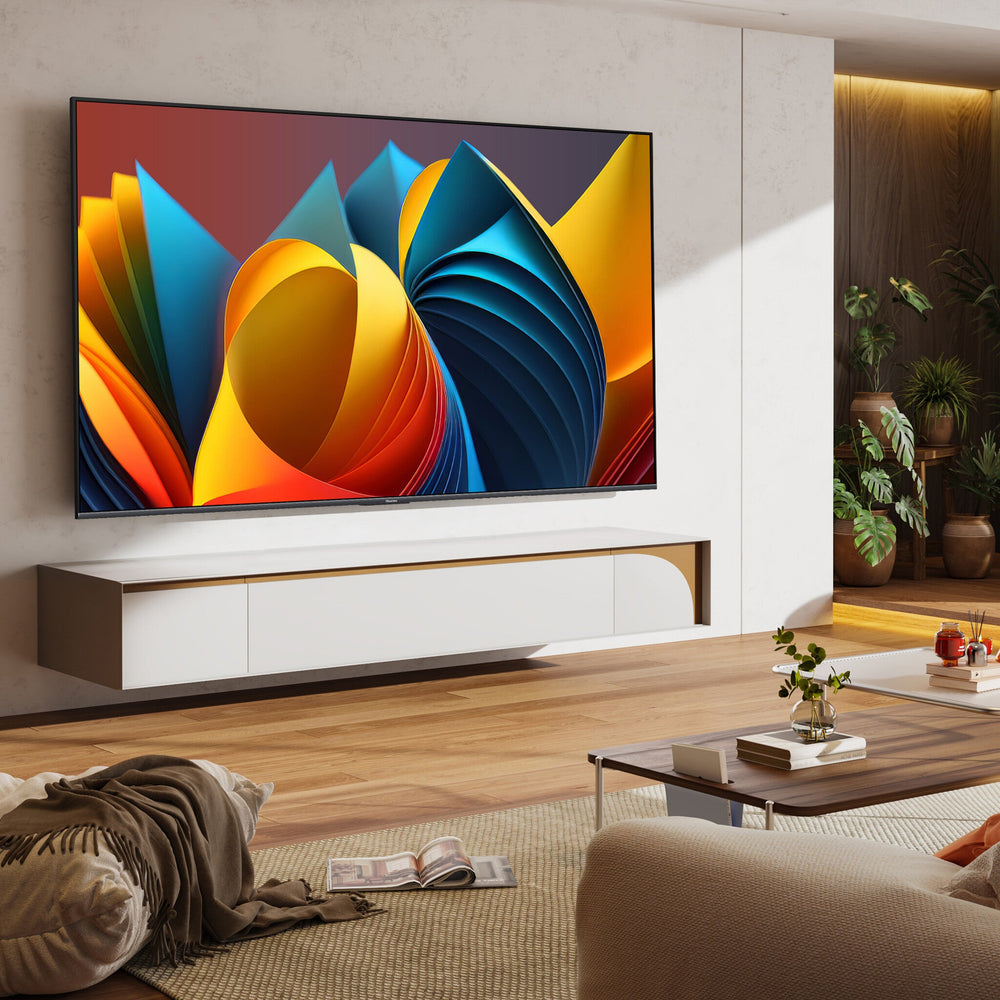Direct Lit Backlight. Quantum Dot Colour. Quad Core 4k Processor. Dolby Atmos. Freely. Dolby Vision. Smooth Motion. The Power of Smart. The Hisense E7N QLED TV is a great addition to any household, bringing all of your content to life in a way that will inspire you. Hosting a wide range of the latest technologies and features you’d expect in far more premium models. This direct lit full array TV is packed with Quantum Dot colour technology bringing your content to life with over a billion colours, Dolby Vision & Atmos for a totally immersive audio and visual experience and Hisense Smooth Motion ensuring the smoothest of images no matter how fast the content. The E7N carry's the VIDAA smart platform, which in FY24 see's the launch of the Freely platform, a huge step forward in seamlessly accessing both live broadcast and catch up services in one intuitive app, all with the benefit of no longer needing an aerial. The VIDAA platform also supports voice control through the ergonomic voice activated remote control enabling you to access content even easier.. Display. Display diagonal (metric). 254 cm. Viewing angle, horizontal. 178°. Viewing angle, vertical. 178°. Dynamic contrast ratio marketing name. Mega Contrast. Contrast ratio (typical). 5000:1. Native refresh rate. 60 Hz. Display brightness. 400 cd/m². Response time. 8 ms. Native aspect ratio. 16:9. Screen shape. Flat. LED backlighting type. Direct-lit LED. LED backlight. Yes. Display technology. QLED. Display resolution. 3840 x 2160 pixels. HD type. 4K Ultra HD. Display diagonal. 2.54 m (100"). TV tuner. Digital signal format system. DVB-C, DVB-S, DVB-S2, DVB-T, DVB-T2. Analog signal format system. Not supported. Tuner type. Digital. Smart TV. Sports apps. BBC Sports. Video apps. All 4, Amazon Prime Video, Apple TV, BBC iPlayer, BritBox, Chili, Disney+, Freely, ITV X, My5, NOW TV, Netflix, Paramount+, Rakuten TV, UKTV Play, YuppTV. Music apps. BBC Sounds, Deezer, YouTube Music. Apple AirPlay 2 support. Yes. Screen mirroring. Yes. Operating system version. U8. Operating system installed. VIDAA. Internet TV. Yes. Smart TV. Yes. Audio. Enhanced Audio Return Channel (eARC). Yes. Audio decoders. DTS:X, Dolby Atmos. Built-in subwoofer. Yes. Subwoofer RMS power. 20 W. RMS rated power. 50 W. Audio output channels. 2.1 channels. Number of speakers. 3. Network. Web browser. Yes. Miracast. Yes. Ethernet LAN. Yes. Bluetooth version. 5.0. Bluetooth. Yes. Wi-Fi. Yes. Design. Stand colour. Black. Stand type. Legs stand. Housing material. Plastic. On/off switch. Yes. Panel mounting interface. 600 x 400 mm. VESA mounting. Yes. Product colour. Black. Performance. USB recording. Yes. Smartphone/tablet remote support. Yes. Parental control. Yes. 4K Ultra HD upscaling. Yes. Plug and Play. Yes. Video upscaling. Yes. AMD FreeSync. Yes. AMD FreeSync type. FreeSync Premium. Processor cores. 4. Eco sensor. Yes. Video formats supported. AVI, H.264, HEVC/H.265, MPEG2, MPEG4, VP9. Game mode. Yes. High Dynamic Range (HDR) technology. Dolby Vision, Dynamic Tone Mapping, High Dynamic Range 10 (HDR10), Hybrid Log-Gamma (HLG). High Dynamic Range (HDR) supported. Yes. Ports & interfaces. AC (power) in. Yes. Common interface Plus (CI+). Yes. Common interface (CI). No. Headphone outputs. 1. Digital audio optical out. 1. Composite video in. 1. USB 2.0 ports quantity. 2. Ethernet LAN (RJ-45) ports. 1. PC in (D-Sub). No. HDCP. Yes. Audio Return Channel (ARC). Yes. HDMI version. 2.0b/2.1. HDMI ports quantity. 4. Management features. Works with Amazon Alexa. Yes. Works with the Google Assistant. Yes. Sleep timer. Yes. Auto power off. Yes. ECO mode. Yes. Number of OSD languages. 34. Programming period. 8 day(s). Electronic Programme Guide (EPG). Yes. Voice guide. Yes. Voice control. Yes. Power. Energy efficiency scale. A to G. Energy saving mode. Yes. AC input frequency. 50/60 Hz. AC input voltage. 100V~240. Energy consumption (HDR) per 1000 hours. 350 kWh. Energy consumption (SDR) per 1000 hours. 183 kWh. Energy efficiency class (HDR). G. Energy efficiency class (SDR). F. Power consumption (standby). 0.5 W. Power consumption (typical). 183 W. Brand-specific features. Hisense technologies (AV/TV). 4K upscaling. Technical details. PSTI certified. Yes. Weight & dimensions. Stand depth. 50 cm. Stand width. 139.3 cm. Weight (without stand). 60 kg. Height (without stand). 1286 mm. Depth (without stand). 101 mm. Width (without stand). 2235 mm. Weight (with stand). 62.5 kg. Height (with stand). 1322 mm. Depth (with stand). 500 mm. Width (with stand). 2235 mm. Packaging data. Package type. Box. Package weight. 84 kg. Package height. 1490 mm. Package depth. 250 mm. Package width. 2398 mm. Manual. Yes. Quick installation guide. Yes. Packaging content. E-manual. Yes. Remote control included. Yes. Cables included. AC. Desktop stand. Yes. Other features. Warranty period. 2 year(s). Country of origin. China. Number of batteries supported. 2. Battery type. AAA. Batteries included. Yes. EU Energy Label. EU Product Fiche. UK Energy Label