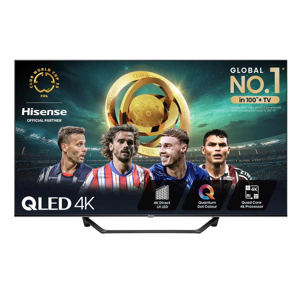 Direct Lit Backlight. Quantum Dot Colour. Quad Core 4k Processor. Dolby Atmos. Freely. Dolby Vision. Smooth Motion. The Power of Smart. Hisense A7N QLED 4K Smart TV lets you enjoy over one billion shades of colours thanks to quantum dot technology meaning you can experience colours as natural . Unlike conventional TVs that tend to blur movement, the A7N with Smooth Motion identifies the smallest details related to fast-moving objects and reconstructs the pixels to restore clean, clear motion giving you great clarity and smooth motion, great for fast paced content like sports and gaming. Bring the true cinematic experience home with support for HDR formats of HDR10, Dolby Vision. Dolby Atmos brings breakthrough immersive audio experience to your home whether it is shows, games or live sports. Hisense’s VIDAA Smart TV OS lets you enjoy all your favourite entertainment from Netflix, Disney+, Prime Video, and Freely, and control your TV using voice with Alexa & Google Assistant built-in.. Display. Display diagonal (metric). 165 cm. Viewing angle, horizontal. 178°. Viewing angle, vertical. 178°. Dynamic contrast ratio marketing name. Mega Contrast. Contrast ratio (typical). 5000:1. Native refresh rate. 60 Hz. Display brightness. 300 cd/m². Response time. 8 ms. Native aspect ratio. 16:9. Screen shape. Flat. LED backlighting type. Direct-lit LED. LED backlight. Yes. Display technology. QLED. Display resolution. 3840 x 2160 pixels. HD type. 4K Ultra HD. Display diagonal. 165.1 cm (65"). TV tuner. Digital signal format system. DVB-C, DVB-S, DVB-S2, DVB-T, DVB-T2. Analog signal format system. Not supported. Tuner type. Digital. Smart TV. Sports apps. BBC Sports. Video apps. All 4, Amazon Prime Video, Apple TV, BBC iPlayer, BritBox, Chili, Disney+, Freely, Freeview Play, ITV X, My5, NOW TV, Netflix, Paramount+, Rakuten TV, UKTV Play, YuppTV. Music apps. BBC Sounds, Deezer, YouTube Music. Apple AirPlay 2 support. Yes. Screen mirroring. Yes. Operating system version. U7.6. Operating system installed. VIDAA. Internet TV. Yes. Smart TV. Yes. Audio. Enhanced Audio Return Channel (eARC). Yes. Audio decoders. DTS, DTS Virtual:X, Dolby Audio. Built-in subwoofer. No. RMS rated power. 20 W. Audio output channels. 2.0 channels. Number of speakers. 2. Network. Web browser. Yes. Ethernet LAN. Yes. Bluetooth version. 4.2. Bluetooth. Yes. Wi-Fi. Yes. Design. Stand colour. Grey. Housing material. Plastic. On/off switch. Yes. Panel mounting interface. 300 x 400 mm. VESA mounting. Yes. Colour name. Charcoal grey. Product colour. Grey. Performance. USB recording. Yes. Parental control. Yes. 4K Ultra HD upscaling. Yes. Plug and Play. Yes. Game features. Auto Low Latency Mode (ALLM), Game Bar, Variable Refresh Rate (VRR). Processor cores. 4. Noise reduction. Yes. Video formats supported. AVI, H.264, HEVC/H.265, MPEG2, MPEG4, VP9. Game mode. Yes. High Dynamic Range (HDR) technology. Dolby Vision, High Dynamic Range 10 (HDR10), Hybrid Log-Gamma (HLG). High Dynamic Range (HDR) supported. Yes. Ports & interfaces. AC (power) in. Yes. Common interface Plus (CI+). Yes. Common interface (CI). No. Headphone outputs. 1. Digital audio optical out. 1. Composite video in. 1. USB 2.0 ports quantity. 2. Ethernet LAN (RJ-45) ports. 1. PC in (D-Sub). No. Audio Return Channel (ARC). Yes. HDMI version. 2.0. HDMI ports quantity. 3. Management features. Works with Amazon Alexa. Yes. Sleep timer. Yes. Number of OSD languages. 34. Programming period. 8 day(s). Electronic Programme Guide (EPG). Yes. Voice guide. Yes. Voice control. Yes. Power. Energy efficiency scale. A to G. Energy consumption (HDR) per 1000 hours. 150 kWh. Energy consumption (SDR) per 1000 hours. 84 kWh. Energy efficiency class (HDR). G. Energy efficiency class (SDR). E. Power consumption (standby). 0.5 W. Brand-specific features. Hisense technologies (AV/TV). 4K upscaling. Weight & dimensions. Weight (without stand). 19.7 kg. Height (without stand). 836 mm. Depth (without stand). 79 mm. Width (without stand). 1451 mm. Weight (with stand). 20.6 kg. Height (with stand). 906 mm. Depth (with stand). 294 mm. Width (with stand). 1451 mm. Packaging data. Package type. Box. Package weight. 28 kg. Package height. 1057 mm. Package depth. 160 mm. Package width. 1649 mm. Manual. Yes. Quick installation guide. Yes. Packaging content. Remote control included. Yes. Cables included. AC. Desktop stand. Yes. Other features. Number of batteries supported. 2. Battery type. AAA. Batteries included. Yes. EU Energy Label. EU Product Fiche. manual pdf. UK Energy Label