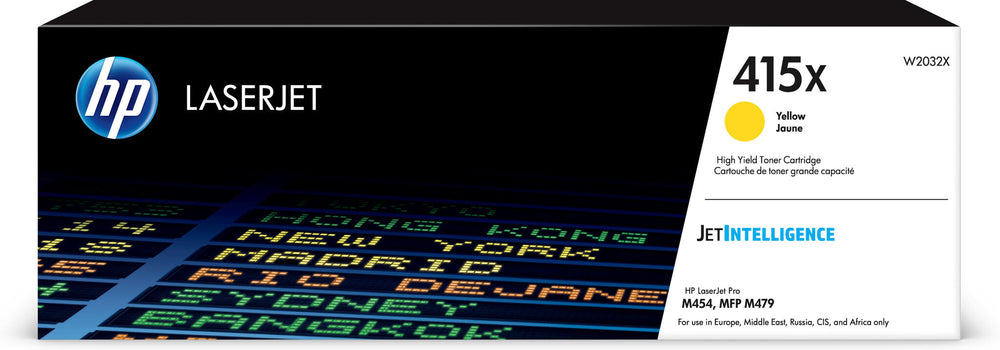 Original HP 415X High Yield Toner Cartridges deliver legendary HP print quality.. HP 415 toner cartridges work with: HP LaserJet Enterprise M455, M480; HP LaserJet Pro M454, M479. 1 Yellow (~6,000 pages). Print high-quality black text and brilliant graphics with Original HP Supplies designed for reliability.. Reliable printing you can trust. Ideal for producing professional-quality colour prints at high speeds your HP printer or MFP was built for, while helping protect against fraud.. Depend on Original HP 415X High Yield Toner Cartridges designed specifically for your HP printer.. Toner cartridge; Recycling guide. Ideal for producing professional-quality colour prints at high speeds your HP printer or MFP was built for, while helping protect against fraud.. Print vibrant colour documents with Original HP Toner cartridges with JetIntelligence designed for your printer. Choose high-yield options for high-volume office printing[1] and protection against counterfeits with HP anti-fraud technology.. Features. HP segment. Small medium business. Country of origin. Japan. OEM code. W2032X. Colour toner page yield. 6000 pages. Cartridge capacity. High (XL) Yield. Colour toner cartridges quantity. 1. Quantity per pack. 1 pc(s). Compatibility. HP 415 toner cartridges work with: HP LaserJet Enterprise M455, M480 HP LaserJet Pro M479. Brand compatibility. HP. Printing colours. Yellow. Type. Original. Operational conditions. Operating temperature (T-T). 10 - 32.5 °C. Operating relative humidity (H-H). 20 - 80%. Storage temperature (T-T). -20 - 40 °C. Storage relative humidity (H-H). 10 - 90%. Weight & dimensions. Weight. 650 g. Height. 123 mm. Depth. 109 mm. Width. 363 mm. Packaging data. Package weight. 900 g. Package height. 123 mm. Package depth. 109 mm. Package width. 363 mm. Brand-specific features. HP GTIN (EAN/UPC). 192018046405. Other features. Print technology. Laser printing. Technical details. Box contents. Toner cartridge; Recycling guide. Logistics data. Pallet dimensions (W x D x H). 1100 x 780 x 1133 mm. Products per pallet. 168 pc(s). Master (outer) cases per pallet. 168 pc(s). Master (outer) cases per pallet layer. 21 pc(s). Layers per pallet. 8 pc(s). Pallet gross weight. 171.7 g. Pallet gross height. 110 cm. Pallet gross length. 78 cm. Pallet gross width. 113.3 cm. Maximum number of stacking cartons. 32 pc(s). Harmonized System (HS) code. 84439990. leaflet. Original HP Toner - Hero video 3D (1:1) - English UK. Original HP Toner Video business graph chart