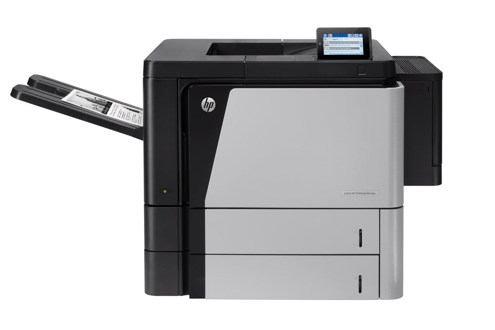 Front-facing USB printing; Two-sided printing. Print. Up to 56 ppm (black). Up to 1200 x 1200 dpi. This A3 HP LaserJet handles big print jobs fast, with extra-large input capacity and versatile paper-handling options. Mobile printing is simple with wireless direct printing[1] and touch-to-print technology[2]. Easy upgrades protect your investment.. Printing. Secure printing. Yes. Time to first page (black, normal). 8.5 s. Print speed (black, normal quality, A3). 28 ppm. Print speed (black, normal quality, A4/US Letter). 56 ppm. Print resolution black. 1200 x 1200 DPI. Maximum resolution. 1200 x 1200 DPI. Duplex printing mode. Auto. Duplex printing. Yes. Print technology. Laser. Colour. No. Features. HP segment. Business. Country of origin. China, Japan, Mexico, Netherlands. Printer fonts. PostScript, Scalable, TrueType, Windows. Page description languages. PCL 5, PCL 6, PDF 1.4, PostScript 3. Number of print cartridges. 1. Printing colours. Black. Recommended duty cycle. 10000 - 50000 pages per month. Maximum duty cycle. 300000 pages per month. Input & output capacity. Maximum output capacity. 3000 sheets. Maximum input capacity. 1100 sheets. Maximum number of input trays. 5. Multi-Purpose tray input capacity. 100 sheets. Multi-Purpose tray. Yes. Paper tray 2 input capacity. 500 sheets. Paper tray 1 input capacity. 100 sheets. Total output capacity. 600 sheets. Total input capacity. 1100 sheets. Total number of input trays. 3. Paper handling. Paper tray media weight. 60 - 220 g/m². Custom media length. 191 - 470 mm. Custom media width. 98 - 312 mm. Envelopes sizes. B5, C5, DL. Non-ISO print media sizes. 16K. ISO C-series sizes (C0...C9). C5. ISO B-series sizes (B0...B9). B4, B5. ISO A-series sizes (A0...A9). A3, A4, A5. Paper tray media types. Bond paper, Card stock, Labels, Letterhead, Plain paper, Recycled paper, Rough paper, Transparencies. Maximum print size. 297 x 420 mm. Maximum ISO A-series paper size. A3. Ports & interfaces. Optional connectivity. Wireless LAN. USB 2.0 ports quantity. 3. USB port. Yes. Standard interfaces. USB 2.0. Network. Mobile printing technologies. Apple AirPrint, HP ePrint, Mopria Print Service. Security algorithms. EAP-PEAP, EAP-TLS, HTTPS, IPSec, SNMPv3, SSL/TLS. Cabling technology. 10/100/1000Base-T(X). Ethernet LAN data rates. 10,100,1000 Mbit/s. Network ready. Yes. Ethernet LAN. Yes. Wi-Fi. No. Performance. Sound power level (printing). 7.2 dB. Sound pressure level (printing). 55 dB. Processor frequency. 800 MHz. Built-in processor. Yes. Internal storage capacity. 8 GB. Memory slots. 1. Maximum internal memory. 1536 MB. Internal memory. 1024 MB. Design. Certification. CISPR 22:2008 / EN 55022:2010 (Class A), EN 61000-3-2 :2006 +A1:2009 +A2:2009; EN 61000-3-3 :2008; EN 55024:2010; FCC Title 47 CFR, Part 15 Class A(USA); ICES-003, Issue 4 (Canada); EMC Directive 2004/108/EC with CE Marking (Europe); other EMC approvals as required by individual countries. Control type. Touch. Display diagonal. 10.9 cm (4.3"). Touchscreen. Yes. Colour display. Yes. Display. LCD. Built-in display. Yes. Product colour. Black, Grey. Market positioning. Business. General. Product family. LaserJet Enterprise. Power. AC input frequency. 50/60 Hz. AC input voltage. 100 - 240 V. Current rating. 5.5 A. Energy Star Typical Electricity Consumption (TEC). 0.832 kWh/week. Power consumption (off). 0.3 W. Power consumption (PowerSave). 2.2 W. Power consumption (standby). 38 W. Power consumption (ready). 38 W. Power consumption (printing). 1000 W. System requirements. Other operating systems supported. Novell, Linux, Android. Server operating systems supported. Windows Server 2008, Windows Server 2012, Windows Server 2003. Linux operating systems supported. Yes. Mac operating systems supported. Mac OS X 10.7 Lion, Mac OS X 10.6 Snow Leopard, Mac OS X 10.8 Mountain Lion. Windows operating systems supported. Windows 8, Windows Vista, Windows 10, Windows 7. Operational conditions. Storage relative humidity (H-H). 10 - 90%. Operating relative humidity (H-H). 10 - 80%. Storage temperature (T-T). 0 - 40 °C. Operating temperature (T-T). 10 - 32.5 °C. Sustainability. Sustainability compliance. Yes. Sustainability certificates. ENERGY STAR, EPEAT Silver. Carbon footprint. Total carbon emissions, w/o use phase (kg of CO2e). 190. Carbon emissions, logistics (kg of CO2e). 34. Carbon emissions, manufacturing (kg of CO2e). 537. Total carbon footprint (kg of CO2e). 830. Weight & dimensions. Pallet dimensions (W x D x H). 856 x 760 x 978 mm. Weight. 76.1 kg. Height. 635 mm. Depth. 648 mm. Width. 1095 mm. Packaging data. Package weight. 88.8 kg. Package height. 978 mm. Package depth. 760 mm. Package width. 856 mm. Packaging content. Bundled software. HP PCL 6 Discrete Printer Driver, Mac SW Link to Web (Mac Installer), Windows Installer. Cables included. AC. Warranty card. Yes. Brand-specific features. HP GTIN (EAN/UPC) with options. (A67) 887758887660; (ABT) 887111365422; (ABY) 887111365439; (ACQ) 887111365446; (B13) 888182819890; (B19) 887111365453; (BAZ) 887111365460. HP GTIN (EAN/UPC). 887758887660, 887111365422, 887111365439, 887111365446, 888182819890, 887111365453, 887111365460. Logistics data. Products per pallet. 1 pc(s). Layers per pallet. 1 pc(s). Pallet gross weight. 88.8 kg. Harmonized System (HS) code. 84433210. Technical details. Master (outer) cases per pallet layer. 1 pc(s). General Product Safety Regulation (GPSR) URL. https://support.hp.com/gb-en/product/setup-user-guides/hp-laserjet-enterprise-m806-printer-series/model/5328918?sku=CZ244A&serialnumber=CZ244A ; https://h10032.www1.hp.com/ctg/Manual/c03664426.pdf ; https://kaas.hpcloud.hp.com/pdf-public/pdf_10348403_en-US-1.pdf. Other features. Acoustic power emissions (ready). 54 dB. Acoustic pressure emissions bystander (ready). 37 dB. Recommended humidity operating range. 10 - 80%. Manufacturer warranty. One-year, next-business day, onsite warranty. Warranty and support options vary by product, country and local legal requirements.