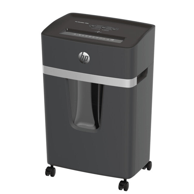 White Micro-cut shredding Working width: 22 cm. Shredding staples Paper shredding Credit cards shredding. Shredding capacity: 10 sheets. Basket volume: 20 L 55 dB. Power consumption (typical): 350 W. With a cutting capacity of 10 sheets, the compact HP Pro Shredder 10MC comes rolling in as the smallest document shredder from the HP Pro Shredder series. Nevertheless, this mobile helper holds its own in the micro cut and is therefore not only suitable for small office environments, but also for medical practices and law firms. The elegantly designed document shredder shreds your personal company data, patient files or process documents in micro cut into 2 mm x 15 mm clippings. This meets the requirements for the high security level P-5 and ensures destruction in accordance with the General Data Protection Regulation. Like the other HP Pro Shredders, the 10MC is pleasantly quiet and produces an operating noise of only 55 decibels.. Features. Duty cycle. 20 min. ISO A-series sizes (A0...A9). A4. Product colour. White. Cut type. Micro cut. Autostop on jamming. Yes. Overheat protection. Yes. Security level (paper). P-5. Shredding speed. 1600 mm/min. Shredding capacity. 10 sheets. Auto power off after. 30 min. Number of wheels. 4 wheel(s). Castor wheels. Yes. Noise level. 55 dB. Control type. Buttons. Basket volume. 20 L. Pull-out bin. Yes. Anti-jam mechanism. Yes. Shredding size. 2 mm. Shredding paper clips. Yes. Shredding staples. Yes. Shredding CDs. No. Paper shredding. Yes. Credit cards shredding. Yes. Working width. 22 cm. Shredding type. Micro-cut shredding. Power. Power save mode. Yes. Current. 2 A. AC input voltage. 220 - 240 V. AC input frequency. 50 Hz. Power consumption (typical). 350 W. Weight & dimensions. Weight. 10.6 kg. Height. 535 mm. Depth. 240 mm. Width. 354 mm. manual pdf. leaflet