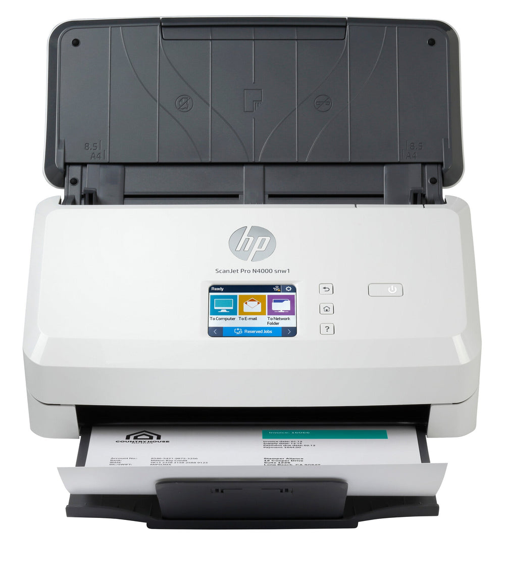 Sheetfed. Up to 600 dpi. Cut Sheet Paper; Printed Paper (Laser and ink); Pre-Punched Paper; Bank Checks; Business Cards; Freight Bills; Carbonless forms; Plastic Carrier sheets for easily damaged documents; Previously stapled media with staple removed; Plastic cards (up to 1.24 mm thickness). Control panel with a total of four buttons on the right side of the resistive touch panel: sleep/power, home, back, help. Resistive, RGB colour and 7.1 cm (2.8 in) touch panel with a resolution of 140 dpi (240 x 320 dots).. 5.9 Watts (ready), 24 Watts (scanning), 1.8 Watts (sleep), 0.1 Watts (auto-off), 0.1 Watts (off). Recommended daily duty cycle: 4000 pages. 7.1 cm (2.8 inch) colour touchscreen on front-panel for HP scan in Win OS, HP Easy Scan/ICA in Mac OS and third parties applications via TWAIN, ISIS and WIA. Get fast, two-sided scans in a single pass – recommended for 4,000 pages per day Fast, affordable, and designed to handle everything from simple colour jobs to complex workflows. Quickly and reliably digitise larger office projects with business scanner speeds up to 40 ppm/80 ipm and a 50-page ADF.[1] Recommended for 4,000 pages per day.. Scanning. Greyscale levels. 256. Duplex scanning. Yes. Colour scanning. Yes. Optical scanning resolution. 600 x 600 DPI. Maximum scan size. 216 x 3100 mm. Design. Touchscreen. Yes. Product colour. Black, White. Built-in display. Yes. Scanner type. Sheet-fed scanner. Performance. HP segment. Business. Built-in processor. Yes. Internal memory. 512 MB. Scan drivers. TWAIN, WIA. Daily duty cycle (max). 4000 pages. Sensor type. CMOS CIS. Input capacity. Auto document feeder (ADF) input capacity. 50 sheets. Paper handling. Auto Document Feeder (ADF) media weight. 40 - 210 g/m². Scanning media types supported. Business Card, Plastic Card. Maximum ISO A-series paper size. A4. Ports & interfaces. USB port. Yes. Network. Ethernet LAN. Yes. Wi-Fi standards. 802.11b, 802.11g, Wi-Fi 4 (802.11n). Wi-Fi. Yes. Power. Input voltage. 90 - 264 V. AC input frequency. 50 - 60 Hz. Power consumption (off). 0.1 W. Power supply type. AC. Weight & dimensions. Weight. 2.8 kg. Height. 154 mm. Depth. 172 mm. Width. 300 mm. Packaging data. Package weight. 4.2 kg. Package height. 242 mm. Package depth. 248 mm. Package width. 397 mm. Quantity per pack. 1 pc(s). Packaging content. Bundled software. Windows: HP WIA scan driver, HP TWAIN scan driver (32-bit and 64-bit), HP Scan, HP Scanner Tools Utility, OpenText ISIS. Cables included. AC, USB. General. Product family. ScanJet Pro. Sustainability. Sustainability compliance. Yes. Sustainability certificates. ENERGY STAR, EPEAT Silver. System requirements. Windows operating systems supported. Windows 10, Windows 7, Windows 8.1, Windows 11, Windows 8. Mac operating systems supported. Mac OS X 10.13 High Sierra, Mac OS X 10.14 Mojave, Mac OS X 10.15 Catalina. Operational conditions. Operating relative humidity (H-H). 15 - 80%. Operating temperature (T-T). 10 - 35 °C. Other features. Box contents. HP ScanJet Pro N4000 snw1 Sheet-feed Scanner; Power cord; Power adapter; USB cable; Scanner engine; Flyers; Install guide. Certification. CISPR 22:2008 & CISPR 32: 2012/ EN 55032:2012 - Class B, EN 61000-3-2: 2014, EN 61000-3-3: 2013, EN 55024: 2010, FCC Title 47 CFR, Part 15 Class B / ICES-003, Issue 6, GB9254-2008, GB17625.1-2012, EN 300 328 V2.1.1. Cabling technology. 10/100Base-T(X). Compliance certificates. RoHS. Image formats supported. BMP, JPEG, PNG, TIFF. Ethernet LAN data rates. 10,100 Mbit/s. Other operating systems supported. Linux. Recommended system requirements. macOS Catalina 10.15,macOS Mojave 10.14, macOS High Sierra 10.13, Microsoft® Windows® 11, 10, 8.1, 7, XP: 32-bit and 64-bit, 2008 R2, 2012 R2, 2016, 2019, 2 GB available hard disk space, CD-ROM/DVD drive or Internet connection, USB port, Microsoft® Internet Explorer. Logistics data. Pallet weight (imperial). 425.9 kg (939 lbs). Layers per pallet. 8 pc(s). Master (outer) cases per pallet layer. 12 pc(s). Pallet gross weight. 426 kg. Harmonized System (HS) code. 8471608000. Country of origin. China. Products per pallet. 96 pc(s). CE marking. CE marking. leaflet