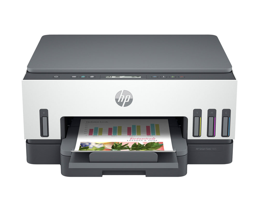 Scan to PDF. Print, scan, copy, wireless. Print speed up to 15 ppm (black) and 9 ppm (color). Up to 1200 x 1200 rendered dpi. Full of features. Full of savings. Printing is seamless from start to finish with a cartridge-free printer designed for the whole family. Create a variety of outstanding-quality colour documents at a low cost, with up to three years of Original HP ink included in the box.[1].. Printing. Borderless printing. Yes. Time to first page (colour, normal). 16 s. Time to first page (black, normal). 14 s. Print speed (ISO/IEC 24734) black. 15 ppm. Print speed (ISO/IEC 24734) colour. 9 ppm. Print speed (colour, draft quality, A4/US Letter). 22 ppm. Print speed (black, draft quality, A4/US Letter). 23 ppm. Print speed (colour, normal quality, A4/US Letter). 9 ppm. Print speed (black, normal quality, A4/US Letter). 15 ppm. Print resolution black. 1200 x 1200 DPI. Print resolution colour. 4800 x 1200 DPI. Maximum resolution. 4800 x 1200 DPI. Duplex printing mode. Auto. Duplex printing. Yes. Printing. Colour printing. Print technology. Thermal inkjet. Copying. Copy margin (custom). Yes. Copy margin (auto center). Yes. Auto fit function. Yes. Copier resize. 25 - 400%. Maximum number of copies. 99 copies. Copy speed (colour, normal quality, A4). 6 cpm. Copy speed (black, normal quality, A4). 13 cpm. Maximum copy resolution. 600 x 600 DPI. Duplex copying. Yes. Copying. Colour copying. Scanning. Scan drivers. TWAIN. Greyscale levels. 256. Input colour depth. 24 bit. Document formats supported. PDF. Image formats supported. BMP, JPEG, PNG, TIFF. Scan speed (colour). 3 ppm. Scan speed (black). 5 ppm. Scan to. Software, E-mail Server. Scan technology. CIS. Scanner type. Flatbed scanner. Maximum scan area. 216 x 297 mm. Maximum scan resolution. 1200 x 1200 DPI. Optical scanning resolution (colour). 1200 x 1200 ppi. Optical scanning resolution (black). 1200 x 1200 ppi. Optical scanning resolution. 1200 x 1200 DPI. Duplex scanning. No. Scanning. Colour scanning. Fax. Faxing. No. Features. HP segment. Home. Replacement cartridges. HP 32XL 135-ml Black bottle (~6000 pages), HP 31 70-ml Cyan bottle (~8000 pages), HP 31 70-ml Magenta bottle (~8000 pages), HP 31 70-ml Yellow bottle (~8000 pages); For more information about fill and yield see https://www.hp.com/go/learnaboutsupplies. Country of origin. China, Thailand. All-In-One-multitasking. Yes. Page description languages. PCL 3 GUI. Printing colours. Black, Cyan, Magenta, Yellow. Number of print cartridges. 4. Recommended duty cycle. 400 - 800 pages per month. Maximum duty cycle. 5000 pages per month. Input & output capacity. Maximum output capacity. 100 sheets. Maximum input capacity. 250 sheets. Maximum number of input trays. 1. Auto document feeder (ADF). No. Total output capacity. 100 sheets. Total input capacity. 250 sheets. Total number of input trays. 1. Paper handling. Paper tray media weight. 60 - 250 g/m². Custom media width. 88.9 - 215.9 mm. Custom media length. 127 - 355.6 mm. Borderless printing media sizes. A4, Letter. Envelopes sizes. C5, C6, DL. JIS B-series sizes (B0...B9). B5. Non-ISO print media sizes. Hagaki card. ISO C-series sizes (C0...C9). C5, C6. ISO B-series sizes (B0...B9). B5. ISO A-series sizes (A0...A9). A4, A5, A6. Paper tray media types. Glossy paper, Matte paper, Photo paper, Plain paper, Recycled paper, Thick paper. Maximum print size. 216 x 355.6 mm. Maximum ISO A-series paper size. A4. Ports & interfaces. USB 2.0 ports quantity. 1. USB port. Yes. Direct printing. Yes. Network. Mobile printing technologies. Apple AirPrint, Mopria Print Service. Bluetooth. Yes. Wi-Fi standards. 802.11b, 802.11g, Wi-Fi 4 (802.11n), Wi-Fi 5 (802.11ac). Wi-Fi Direct. Yes. Wi-Fi. Yes. General. Product family. Smart Tank. Performance. Sound power level (printing). 6.5 dB. Processor frequency. 800 MHz. Built-in processor. Yes. Card reader integrated. No. Maximum internal memory. 128 MB. Internal memory. 128 MB. Design. Control type. Buttons. Display diagonal. 5.08 cm (2"). Display. LCD. Built-in display. Yes. Market positioning. Home & office. Product colour. Grey, White. Power. AC input voltage. 100 - 240 V. AC input frequency. 50/60 Hz. Energy Star Typical Electricity Consumption (TEC). 0.3 kWh/week. Power consumption (off). 0.1 W. Power consumption (sleep). 2 W. Brand-specific features. HP GTIN (EAN/UPC) with options. (622) 198828246295; (BHC) 195908302377. HP GTIN (EAN/UPC). 198828246295, 195908302377. System requirements. Mac operating systems supported. Mac OS X 12.0 Monterey, Mac OS X 13.0 Ventura. Windows operating systems supported. Windows 10, Windows 11, Windows 7. Operational conditions. Recommended humidity operating range. 20 - 80%. Non-operating relative humidity (non-condensing). 5 - 90%. Operating relative humidity (H-H). 15 - 80%. Operating temperature (T-T). 5 - 40 °C. Storage temperature (T-T). -40 - 60 °C. Certificates. Certification. CISPR 32:2015/EN 55032:2015+A11:2020 Class B; CISPR24:2010+A1:2015/EN 55024:2010+A1:2015; EN55035:2017+A11:2020/CISPR35:2016; EN 61000-3-2:2019; EN 61000-3-3:2013+A1:2019; FCC CFR 47 Part 15 Subpart B; ICES-003 Issue 7:2020; EN 301 489-1 V2.2.3; EN 301 489-17 V3.2.2. Sustainability. Sustainability compliance. Yes. Sustainability certificates. Blue Angel, Post-Consumer Recycled Plastic. Sustainable technologies and materials. 25% post-consumer recycled plastic; Recyclable through HP Planet Partners. Carbon footprint. Total carbon emissions, w/o use phase (kg of CO2e). 1. Carbon emissions, end-of-life (kg of CO2e). 3. Carbon emissions, logistics (kg of CO2e). 2. Carbon emissions, manufacturing (kg of CO2e). 40. Total carbon footprint (kg of CO2e). 50. Weight & dimensions. Weight. 6.38 kg. Height. 198.6 mm. Depth. 364 mm. Width. 427.5 mm. Packaging data. Package weight. 9.2 kg. Package height. 410 mm. Package depth. 239 mm. Package width. 484 mm. Packaging content. Bundled software. HP Printer Software, available online. Warranty card. Yes. Cables included. AC. Logistics data. P