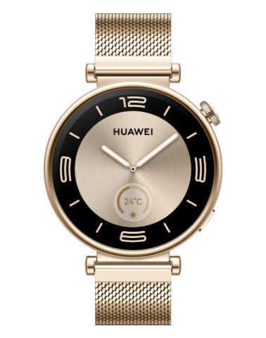 Smartwatch Digital 3.35 cm (1.32") AMOLED. 466 x 466 pixels. Waterproof Water resistance: 5 ATM. Built-in microphone Built-in speaker(s). Heart rate monitor Accelerometer Gyroscope. GPS (satellite). Wi-Fi Bluetooth 5.2 Near Field Communication (NFC). Built-in battery Lithium Polymer (LiPo) 323 mAh 168 h. HUAWEI WATCH GT 4. Geometric Aesthetics | All-new Calorie Management |. Up to 2 Weeks Battery Life. Fashion, never stops.. Pushing boundaries through technology.. To cross, to sport, to explore.. Huawei Wearable. Fashion Forward.. Slimmed Down, Spaced Out. With its airy-light form and 13% higher screen-to-body ratio, bordered by a thin bezel, this watch gives you the fit you crave and a view to savour.. Dazzling Watch Faces to Choose from. With 25,000+ exquisite watch faces to browse, including Blooming watch face, which flowers as your daily activity data grows, and Always On Display watch faces, an idle moment is all you need to experience something new.. Custom Watch Faces. Create watch faces of your own, with tailored functions, styles, and colour schemes, to showcase your creative side -- or custom widgets, to switch seamlessly between apps.. Complete All 3 Rings. Set daily goals for Activity Rings 2.0, with Move, Exercise, and Stand measurements, to get a move on your health – minute-by-minute. When you achieve the three-ring goal, you will receive a medal reward.. Can-Do Calorie Management. The new Stay Fit app6 backed by HUAWEI TruSeen™ 5.5+ tech helps you keep track of how many calories you're consuming at a glance, with high-level metrics like real-time calorie intake, active calories, resting calories, and calorie deficit.. Workout Heart Rate Monitoring. Don't miss a beat, with the new and improved HUAWEI TruSeen™ 5.5+ heart rate, and get timely voice or vibration reminders whenever your heart rate strays from its target zone. The heart rate monitor continues to work well, even in cold-weather environments.. Enhanced Route Tracking. A smart satellite antenna array boosts the accuracy of HUAWEI WATCH GT 4 46 mm's GNSS signals by 30%,10 to keep you on track in avenues, parks or residential units. And with a smart fusion positioning algorithm, the watch gets increasingly accurate the more times you run.. Vital Sign Tracker. The watch's HUAWEI TruSeen™ 5.5+ system tracks heart rate, SpO2, sleep, and stress with pinpoint precision, keeping you in the know all the time.. Pulse Wave Arrhythmia Analysis. Stay on top of your heart health, with timely alerts on potential A-fib and premature beat risks, powered by the PPG sensor.. Sleep Tight Every Night. Hit the hay with peace of mind, thanks to the HUAWEI TruSleep™ 3.0 monitoring system, which tracks your slumber, and detects abnormal breathing during sleep.. Special Attention to Women's Health. Get estimated period, ovulation, and fertile times at just a glance, which are based on high-level physiological data and a deep learning algorithm.. Listen Without Limits. HUAWEI WATCH GT 4 supports independent music playback. Set playlists in the phone app and match them to specific workouts – to get in your groove even when your phone isn't on hand!. Power Up in a Pinch. HUAWEI WATCH GT 4 46 mm lasts a staggering 14 days on a full charge, and HUAWEI WATCH GT 4 41 mm lasts 7 days.. Broadly Compatible. HUAWEI WATCH GT 4 is compatible with both iOS and Android phones, for greater ease of use.. Display. Pixel density. 352 ppi. Display diagonal. 3.35 cm (1.32"). Display technology. AMOLED. Touchscreen. No. Display resolution. 466 x 466 pixels. Display type. Digital. Performance. Flash memory. 32 GB. Mobile operating systems supported. Android 10, Android 10.0, Android 11.0, Android 12.0, Android 13.0, Android 8.0, Android 8.1, Android 9.0, iOS 13, iOS 13.4, iOS 14, iOS 14.5, iOS 15, iOS 16. FM radio. No. Built-in camera. No. Built-in speaker(s). Yes. Built-in microphone. Yes. Design. Water resistance. 5 ATM. Protection features. Waterproof. Maximum strap length. 19 cm. Minimum strap length. 12 cm. Shape. Rectangular. Band colour. Gold. Watch case material. Gold. Watch case colour. Gold. Watch case size. 41 mm. Market positioning. Smartwatch. Features. Barometer. Yes. Stopwatch. Yes. Call notifications. Yes. Alarm clock. Yes. Electronic compass. Yes. Skin temperature sensor. Yes. Ambient light sensor. Yes. SMS notifications. Yes. Activity monitoring. Yes. Workout tracking. Yes. Recommended activity. Fitness. Quality of sleep. Yes. Gyroscope. Yes. Accelerometer. Yes. Calories burned. Yes. Pedometer. Yes. Blood oxygen sensor. Yes. Heart rate sensor type. Optical. Heart rate monitor. Yes. Network. GPS (satellite). Yes. Mobile network connection. No. Ports & interfaces. Headphone connectivity. No. Near Field Communication (NFC). Yes. Bluetooth Low Energy (BLE). Yes. Bluetooth version. 5.2. Bluetooth. Yes. Wi-Fi. Yes. USB port. No. Power. Wireless charging. Yes. Charging time. 1.5 h. Battery life (max). 168 h. Battery capacity. 323 mAh. Battery technology. Lithium Polymer (LiPo). Battery type. Built-in battery. Operational conditions. Operating temperature (T-T). -20 - 45 °C. Weight & dimensions. Weight. 37 g. Thickness. 9.8 mm. Depth. 41.3 mm. Width. 41.3 mm. Packaging data. Package height. 65 mm. Package depth. 120 mm. Package width. 120 mm. Packaging content. Charger. Yes. Quick installation guide. Yes. Warranty card. Yes