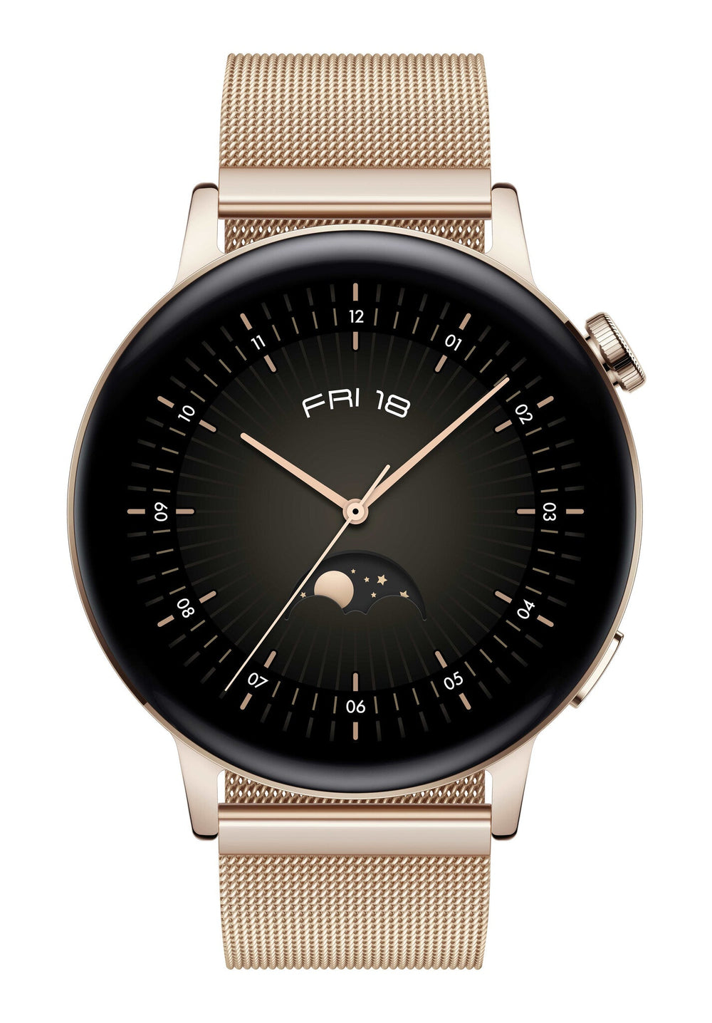 Up to 2 Weeks' Battery Life. Accurate Heart Rates & Positioning. All-Day Health Monitoring. HUAWEI WATCH GT3 42mm is a smartwatch with 7-day battery lif and 5 ATM water resistence. It integrates workout monitoring, music playback, HUAWEI TruSleep, heart rate monitoring, bluetooth calling, NFC, GPS and wireless charging. The product is suitable for both daily use and professional sports. Display. Display diagonal. 3.35 cm (1.32"). Display technology. AMOLED. Touchscreen. Yes. Display resolution. 466 x 466 pixels. Display type. Digital. Performance. Flash memory. 4 GB. Operating system installed. HarmonyOS. Mobile operating systems supported. Android 6.0, Android 7.0, Android 7.1, Android 7.1.2, Android 8.0, Android 9.0, iOS 10.0, iOS 11.0, iOS 11.4, iOS 12, iOS 13, iOS 14.5, iOS 9.0, iOS 9.1, iOS 9.2, iOS 9.3. Design. Water resistance. 5 ATM. Removable strap. Yes. Colour name. Light Gold. Buckle colour. Gold. Suggested gender. Unisex. Maximum strap length. 19 cm. Shape. Round. Band size. One Size. Band material. Milanese. Band colour. Gold. Watch case colour. Gold. Watch case size. 42 mm. Market positioning. Smartwatch. Features. Country of origin. China. Barometer. Yes. Clock mode. 12h/24h. Geomagnetic sensor. Yes. E-mail. Yes. Calendar notifications. Yes. Skin temperature sensor. Yes. Stress monitoring function. Yes. Ambient light sensor. Yes. Instant messaging (IM). Yes. Short Message Service (SMS). Yes. Quality of sleep. Yes. Activity tracker. Yes. Gyroscope. Yes. Accelerometer. Yes. Heart rate sensor type. Optical. Heart rate monitor. Yes. Network. GPS (satellite). Yes. Mobile network connection. No. Ports & interfaces. Near Field Communication (NFC). No. Bluetooth Low Energy (BLE). Yes. Bluetooth version. 5.2. Wi-Fi. No. Power. Standby time. 168 h. Charging time. 2 h. Battery capacity. 292 mAh. Battery technology. Lithium Polymer (LiPo). General. Product family. WATCH. Product series. GT. Weight & dimensions. Band width. 2.2 cm. Weight. 35 g. Thickness. 1.02 cm. Width. 42.3 mm. Packaging data. Package height. 120 mm. Package depth. 80 mm. Package width. 120 mm. Packaging content. Manual. Yes. Warranty card. Yes. Logistics data. Harmonized System (HS) code. 91021200. Commodity Classification Automated Tracking System (CCATS). 8423109000