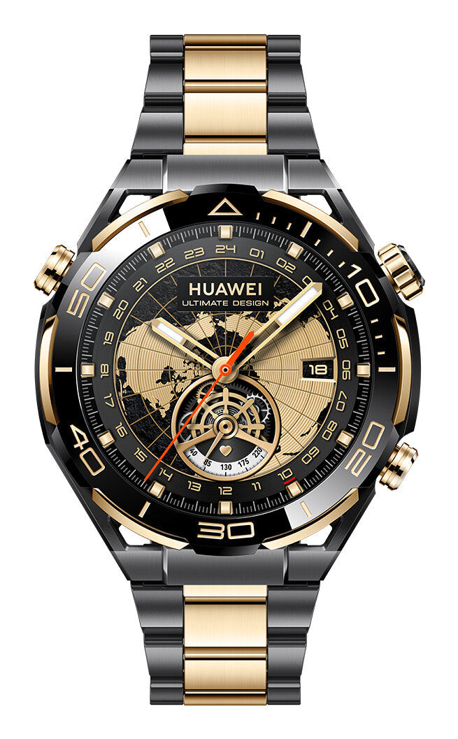 Smartwatch Digital 3.81 cm (1.5") AMOLED. 466 x 466 pixels. Water resistance: 10 ATM. Built-in microphone Built-in speaker(s). Heart rate monitor Accelerometer Gyroscope. GPS (satellite). Bluetooth 5.2 Near Field Communication (NFC). Built-in battery 530 mAh 14 h. HUAWEI WATCH ULTIMATE DESIGN. Beauty that Stands the Test of Time. Explore Your World. Expand Your Horizons. Bask in the Glow. HUAWEI WATCH ULTIMATE DESIGN is your safe harbour in stormy seas, with its rudder-like black nanocrystal ceramic bezel and six 18K gold inlays, shining beacons guiding you through the night! Strap it round your wrist – it's ready to make a splash!. Gold Bezel. HUAWEI WATCH ULTIMATE DESIGN exudes luxury in every detail. Six segments of 18K gold are inlaid at the edge of the nanocrystal ceramic bezel.. Ornate character engravings, forged by Physical Vapour Deposition technology, add the finishing touch to this timeless classic.. Gold Crown. Exquisite 3D trapezoidal patterns on the crown are carved with diamond tools, and interact with the embedded gold to produce a glamourous look and glossy feel.. Triple-Mesh Chain Strap. Switch to the gold and black chain strap, and have your inner beauty shine through on even the darkest night.. Adjustable Butterfly Buckle. With 12 levels (adjustment precision: 1.45 mm per level) and 17.4 mm of adjustments, you can get that perfect fit without having to open a toolbox.. Watch Faces Galore!. Catch a glimpse at the globe on your wrist, with longitude and latitude lines, watch as your heart beat pulsates on screen, or go with the glamourous golden life theme – with so many dazzling watch faces to choose from, it's truly the best of all worlds!. Standout Water Resistance. Enjoy peace of mind when you take the plunge, with 10 ATM water resistance, certified 100-metre diving accessory support, a diverse array of diving modes, including scuba diving and free diving, and a wealth of underwater data.. Bluetooth Calling. Answer and reject incoming calls, send out custom quick replies, and view call logs, to stay plugged in even when you're checking out.. Wealth of Third-Party Apps. Download your favourite apps through Watch AppGallery, to stay informed and entertained with just a flick of the wrist.. Powers Your Days. HUAWEI WATCH ULTIMATE DESIGN offers blazing-fast wireless charging, and lasts up to 14 days on a full charge before needing another boost, making it a reliable companion on your outdoor adventures.. Luxurious Gift Box. The watch comes in a black leather gift box with a plush brown interior, creating a special memory as soon as it's opened.. Display. Pixel density. 311 ppi. Display diagonal. 3.81 cm (1.5"). Display technology. AMOLED. Display resolution. 466 x 466 pixels. Display type. Digital. Performance. FM radio. No. Built-in camera. No. Built-in speaker(s). Yes. Built-in microphone. Yes. Design. Water resistance. 10 ATM. Shape. Round. Lens material. Sapphire. Band material. Titanium. Band colour. Black, Gold. Watch case material. Ceramic, Gold. Watch case colour. Black, Gold. Watch case size. 49.4 mm. Market positioning. Smartwatch. Features. Barometer. Yes. Stopwatch. Yes. Caller ID. Yes. Electronic compass. Yes. Skin temperature sensor. Yes. Ambient light sensor. Yes. Recommended activity. Fitness. Magnetometer. Yes. Gyroscope. Yes. Accelerometer. Yes. Calories burned. Yes. Pedometer. Yes. Blood oxygen sensor. Yes. Heart rate sensor type. Optical. Heart rate monitor. Yes. Network. GPS (satellite). Yes. Mobile network connection. No. Ports & interfaces. Headphone connectivity. No. Near Field Communication (NFC). Yes. Bluetooth Low Energy (BLE). Yes. Bluetooth version. 5.2. Bluetooth. Yes. Wi-Fi. No. USB port. No. Power. Battery life (max). 14 h. Battery capacity. 530 mAh. Battery type. Built-in battery. Operational conditions. Operating temperature (T-T). -20 - 45 °C. Weight & dimensions. Weight. 78 g. Thickness. 1.3 cm. Depth. 49.4 mm. Width. 49.4 mm. Packaging data. Package height. 65 mm. Package depth. 140 mm. Package width. 140 mm. Packaging content. Quick installation guide. Yes. Charging base. Yes. Huawei watch ultimate design
