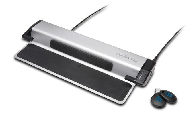 K-Fob™ Smart Lock Technology combines encrypted security with the simplicity of keyless locking.. Professional Design meets Kensington’s industry-leading testing standards for durability and provides unobstructed access to the laptop’s side ports.. Non-Invasive Locking requires no laptop modifications.. Adjustable Security Arms accommodate 11”-15.6” laptops and easily adjust without tools.. Scratch-Resistant Bumpers protect laptop screen and frame from cosmetic damage.. Flexible Security Options allow you to secure the station to any fixed object using the removable tethered lock cable or permanently secure using the desktop mounting hole.. Master Keyed Option provides a simple keying solution for IT.. The next generation of physical laptop security has arrived. Incorporating Kensington’s encrypted digital locking technology, and engineered to be the most secure and convenient laptop lock available, the Laptop Locking Station with K-Fob ™ Smart Lock is a professional locking solution for today’s thin and light laptops. Designed to reduce theft and improve compliance with corporate security protocols, the Laptop Locking Station with K-Fob Smart Lock uses premium materials and provides the trusted protection that has made Kensington The Professionals’ Choice ™ in laptop security for over 25 years. Secures MacBook and most Dell, HP and Lenovo models.. K-Fob™ Smart Lock Technology combines encrypted security with the simplicity of keyless locking.. Professional Design meets Kensington’s industry-leading testing standards for durability and provides unobstructed access to the laptop’s side ports.. Non-Invasive Locking requires no laptop modifications.. Adjustable Security Arms accommodate 11”-15.6” laptops and easily adjust without tools.. Scratch-Resistant Bumpers protect laptop screen and frame from cosmetic damage.. Flexible Security Options allow you to secure the station to any fixed object using the removable tethered lock cable or permanently secure using the desktop mounting hole.. Master Keyed Option provides a simple keying solution for IT.. Compatible with the new MacBook Pro 16-inch.. Features. Certification. FCC, CE, RCM, IC, WEEE, REACH, RoHS. Locking. Yes. Material. Aluminium, Plastic. Lock type. Flat key. Best uses. Laptop. Product colour. Aluminium, Black. Weight & dimensions. Weight. 1.3 kg. Height. 35.5 mm. Depth. 124.5 mm. Width. 310 mm. Cable diameter. 4 mm. Cable length. 1.8 m. Packaging data. Package weight. 1.9 kg. Package height. 60 mm. Package depth. 222 mm. Package width. 360 mm. Logistics data. Products per master (outer) case. 5 pc(s). Master (outer) case height. 245 mm. Master (outer) case length. 370 mm. Master (outer) case width. 320 mm. leaflet. manual pdf