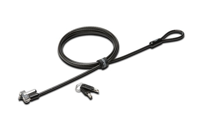 Slim profile made especially for ultra-thin and 2-in-1 laptops. Tested and approved by Dell.. Does not block valuable ports, allowing for full use of laptop’s ports while attached.. Won’t raise the laptop off its surface and cause it to wobble, allowing the laptop to lie flat and stable.. Kensington locks are verified and tested. Each lock is precision engineered to meet or exceed rigorous industry standards for strength, physical endurance and mechanical resilience.. 1.8m (6’) carbon steel cable delivers the same level of cut-resistance and theft-resistance as thicker cables. Special hinges create great freedom of movement, eliminating awkward angles and allowing you to insert your key with complete ease.. The 5mm keying system is common across all of Kensington’s latest locks, so there’s only one keying system to manage.. Register & Retrieve™, Kensington’s online key registration programme, allows for quick, secure and free key replacement if ever lost or stolen.. Master keyed provides administrative access, so the IT manager can have a key for all locks while each user has their own individual lock and key. Each employee can protect their device with their lock while a master key provides IT universal access to unlock any piece of equipment for upgrades, relocation, replacement or misplaced/lost keys.. A five-year warranty means you can rest assured knowing you’re covered by Kensington.. Tough Lock Head. Designed for laptops and tablets with a wedge-shaped lock slot, it meets Kensington’s industry-leading testing standards for tamper-resistance, reliability and durability.. Unique Lock Engagement. Expanding side “hooks” grab the internal sides of the wedge-shaped lock slot, creating a strong connection between the device frame and the lock to resist and deter theft.. 5mm Keying System. A central pillar of Kensington’s industry-leading locking solutions, the exclusive keying system is common across all of Kensington’s latest locks. Our unparalleled custom management options provide flexibility, and our patented anti-pick Hidden Pin™ Technology offer complete peace of mind. Now IT directors will only have one keying system to manage across their organization.. Carbon Steel Cable. Offering the same level of cut-resistance and theft-resistance as thicker cables, the carbon steel cable with plastic sheath offers security and greater mobility with 6 feet of cable.. Pivot and Rotate Cable. Special hinge creates great freedom of movement, eliminating awkward angles and allowing you to insert your key with complete ease. Verified & Tested. Engineered to Kensington’s rigorous specifications and third-party standards in torque/pull, foreign implements, lock lifecycle, corrosion, key strength and other environmental conditions.. Register & Retrieve. Kensington’s online key registration program that allows for quick, secure and easy key replacement if it ever gets lost or stolen. - Tough lock head that fits seamlessly into the latest Dell laptops and tablets with a wedge-shaped lock slot. - Unique lock engagement creates the strongest connection between the lock head and wedge-shaped lock slot. - 5mm Keying System featuring patented anti-pick Hidden Pin Technology is compatible for custom solutions across different styles of Kensington locks. - Carbon steel cable is cut-resistant and anchors to desk, table or any fixed structure. - Pivot and rotate cable provides superior laptop engagement. - Independently verified and tested for industry-leading standards in torque/pull, foreign implements, lock lifecycle, corrosion, key strength and other environmental conditions. - Register & Retrieve™ program allows you to order replacement keys. Features. Material. Carbon steel. Cable lock slot type. Kensington. Lock type. Key. Best uses. Laptop. Product colour. Black. Weight & dimensions. Cable diameter. 5 mm. Packaging data. Quantity per pack. 25 pc(s). Logistics data. Harmonized System (HS) code. 83014090. manual pdf