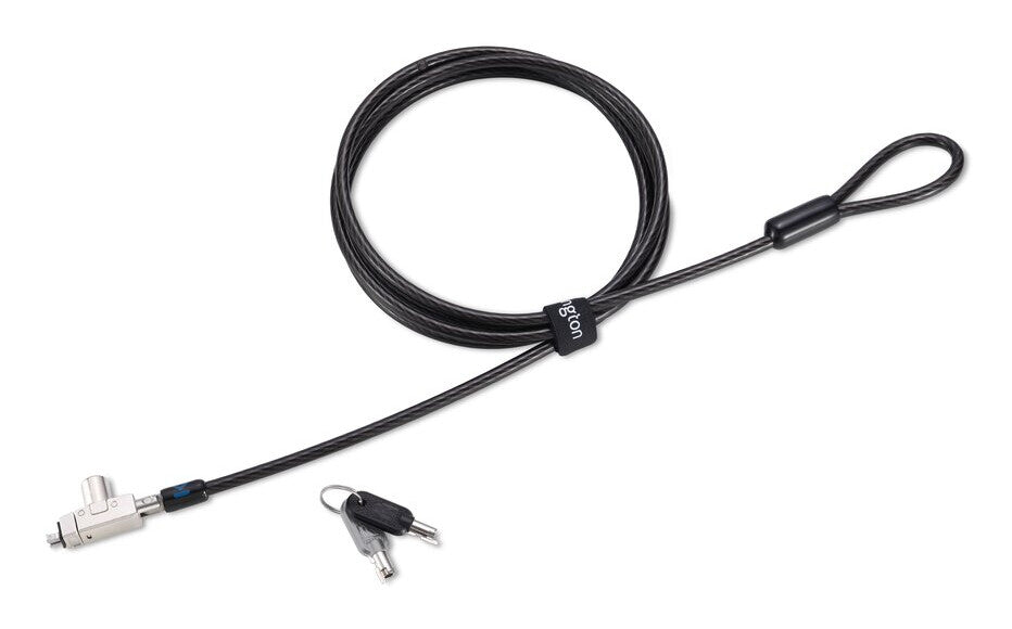 Compatible with the wedge-shaped security slot found in Dell 2017 (& later models) and other manufacturer's devices. The N17 Keyed Laptop Lock allows your laptop or device to be anchored to a fixed object, deterring opportunistic theft. Expanding 'hooks' grab the internal side of the wedge-shaped slot, creating a strong connection between the device frame and lock. Fully rotating cable creates greater freedom of movement, allowing you to insert your key with complete ease. Carbon steel cable is cut-resistant and anchors to desk, table or any fixed structure. Engineered to rigorous specifications in torque/pull, foreign implements, lock lifecycle, corrosion and key strength. The N17 Keyed Laptop Lock allows laptops and devices using the wedge-shaped security slot to be anchored to a fixed object, deterring opportunistic theft. The tough and compact lock head is ideal for today's ultra-thin devices, with unique lock engagement creating the strongest connection between the lock and security slot.. Features. Certification. REACH, WEEE, RoHS. Country of origin. Taiwan. Locking. Yes. Cable type. Standard. Number of keys provided. 2. Material. Carbon steel. Cable lock slot type. Kensington. Lock type. Key. Best uses. Laptop. Product colour. Black, Silver. Weight & dimensions. Weight. 200 g. Depth. 28 mm. Cable diameter. 5 mm. Cable length. 1.83 m. Packaging data. Package weight. 200 g. Package type. Polybag. Package height. 220 mm. Package depth. 25 mm. Package width. 160 mm. Manual. Yes. Quantity per pack. 1 pc(s). Logistics data. Harmonized System (HS) code. 83014090. Technical details. Brand. Dell. manual pdf. manual pdf. leaflet