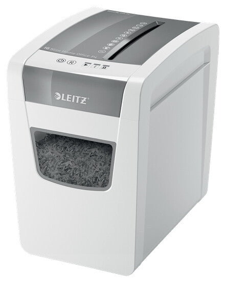 Quiet operation - for a calm working environment (when using Leitz oil papers regularly). Shreds up to 10 sheets of A4 per pass - your companion at your desk. Anti jam technology for uninterrupted shredding - automatically stops and reverses the paper out when too much paper is inserted. Continuous 6 minute run time - ideal for occasional shredding use. LED light signals when the shredder needs to stop to cool down. 1.8 meter per minute shred speed. Touch-Control - simple and intuitive for easy operation. Slim design with an easy to empty 23L bin - fits in smaller spaces and holds up to 225 sheets before it needs to be emptied. 2+1 years guarantee - register to get your extra year. Also shreds staples and paper clips. Offering a stylish slim design this shredder from Leitz is ideal for all your home office shredder needs. Compact slim size for easy positioning, ideal for the home office user. Bring some style to your home office with this anti jam, quiet and long running shredder. Shred 10 sheets of A4 into the generous 23L bin with simple operation using touch controls. Increase the security in your document destruction with this Security DIN P4 shredder.. Features. Duty cycle. 6 min. ISO A-series sizes (A0...A9). A4. Product colour. White. Cut type. Cross cut. Security level (paper). P-4. Noise level. 58 dB. Control type. Touch. Basket volume. 23 L. Basket capacity. 10 sheets. Shredding size. 28 mm. Shredding paper clips. Yes. Shredding staples. Yes. Shredding CDs. No. Paper shredding. Yes. Credit cards shredding. No. Working width. 22 cm. Shredding type. Cross shredding. Power. Power consumption (typical). 280 W. Weight & dimensions. Weight. 6.5 kg. Height. 375 mm. Depth. 370 mm. Width. 255 mm. Other features. Warranty period. 2 year(s)