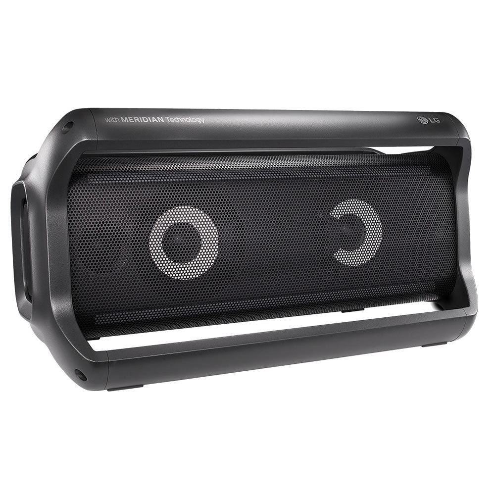 to splashes of liquid from the likes of rain or drinks. Party on whatever the weather. A grip for the x-treme. The intuitively sculpted grab and go design features two protruding handles which make f quality sound every day. Together with Meridian, British pioneers of high resolution audio, LG will deliver an exceptional sound experience to music lovers across the world. Experience exceptional so you play your favourite songs with unique technologies from Meridian Audio. "Clear Vocal" allows you to listen to the singers' crisp and detailed vocals without distortion at the highest volume. The ' bass tones. Lighting you will love. LG's PK7 Portable LOUDR Bluetooth Speaker has Multi Colour Lighting built-in, dancing to the beat of your tunes. With multiple customisable Lighting Modes to choos you can now create the ultimate party atmosphere from the palm of your hand! The Dual Passive Radiators act like mini bass drivers that not only provide an outstanding bass but also more energy to th bass and be blown away as the sides pulse with energy and passion. Dual tweeters give additional crispness to aid in the delivery of accurate and natural musical instruments and vocals. Hi-Fi music HD technology enables bigger transfers of data from playback source to speaker, delivering 24-bit audio output. Enjoy superior sound quality from the PK7 through advanced engineering by LG. Voice com a smartphone connected to the PK7, simply hit the voice button on the speaker and ask it to play your next track. This command will be relayed to your smartphone and the PK7 will pump out the party! hands free, voice control. * *Requires Andorid or iOS device with voice activation technology and music streaming service subscription. Add excitement to any party with vibrant colours that pulse to woofers not only have multi-colour lighting but also have sparkle strip lighting above and below to add passion to the party. Sound come rain or shine. Advanced IPX5 technology keeps your speaker ful to splashes of liquid from the likes of rain or drinks. Party on whatever the weather. A grip for the x-treme. The intuitively sculpted grab and go design features two protruding handles which make f