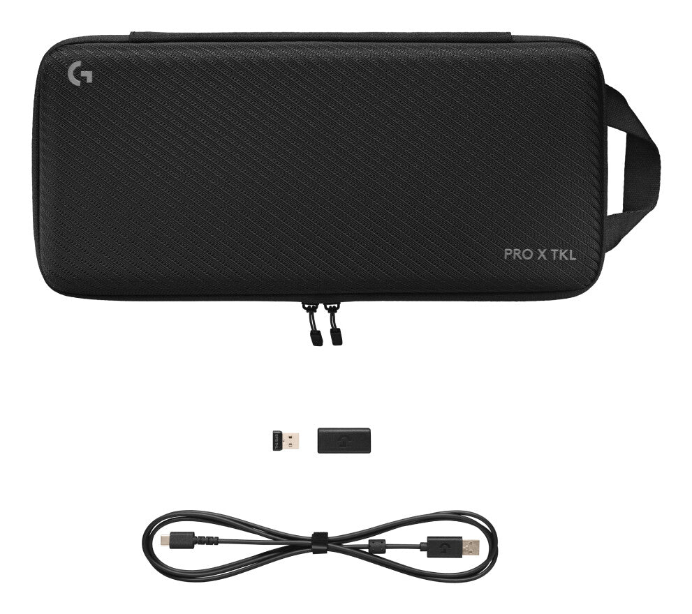 LIGHTSPEED Wireless with upto 50 hrs of battery life. Multiple connection options lightspeed and bluetooth. Keyboard. Key response time (min). 1 ms. Frequency band. 2.4 GHz. Multimedia keys. Yes. Hot keys. Yes. Keyboard key profile. High-profile. Keycaps material. Polybutylene terephthalate (PBT). Numeric keypad. No. Keyboard form factor. Tenkeyless (80 - 87%). Pointing device. No. Keyboard language. UK English. Keyboard layout. QWERTY. Keyboard key switch technology. Logitech Tactile. Keyboard key switch. Mechanical. Device interface. RF Wireless + Bluetooth. Connectivity technology. Wireless. Recommended usage. Gaming. Design. LED indicators. Yes. Surface coloration. Monochromatic. Product colour. Black. Adjustable keyboard height. Yes. Keyboard style. Straight. Backlight colour. Multicolour. Backlight type. RGB LED. Backlight. Yes. Features. Detachable cable. Yes. Cable length. 1.83 m. USB connector type. USB Type-A. Wireless range. 10 m. Power. Charging source. USB Type-C. Battery recharge time. 50 h. Battery capacity. 1500 mAh. Keyboard battery type. Built-in battery. Power source type. Battery. Mouse. Mouse included. No. System requirements. Windows operating systems supported. Yes. Weight & dimensions. Keyboard weight. 1.01 kg. Keyboard dimensions (WxDxH). 352 x 150 x 34 mm. Packaging data. Pouch. Yes. Packaging content. User guide. Yes. Adapters included. USB. Cables included. USB Type-A - USB Type-C. Batteries included. Yes. Wireless receiver interface. USB Type-A. Receiver included. Yes. Number of products included. 1 pc(s). Other features. Technology. LIGHTSPEED. Compatibility. PRO X TKL Gaming KeyboardUSB LIGHTSPEED adapterAdapter extensionUSB-A to USB-C charging and data cableCarrying caseUser documentation. manual pdfPRO X TKL | ZERO OPPOSITION | Logitech G