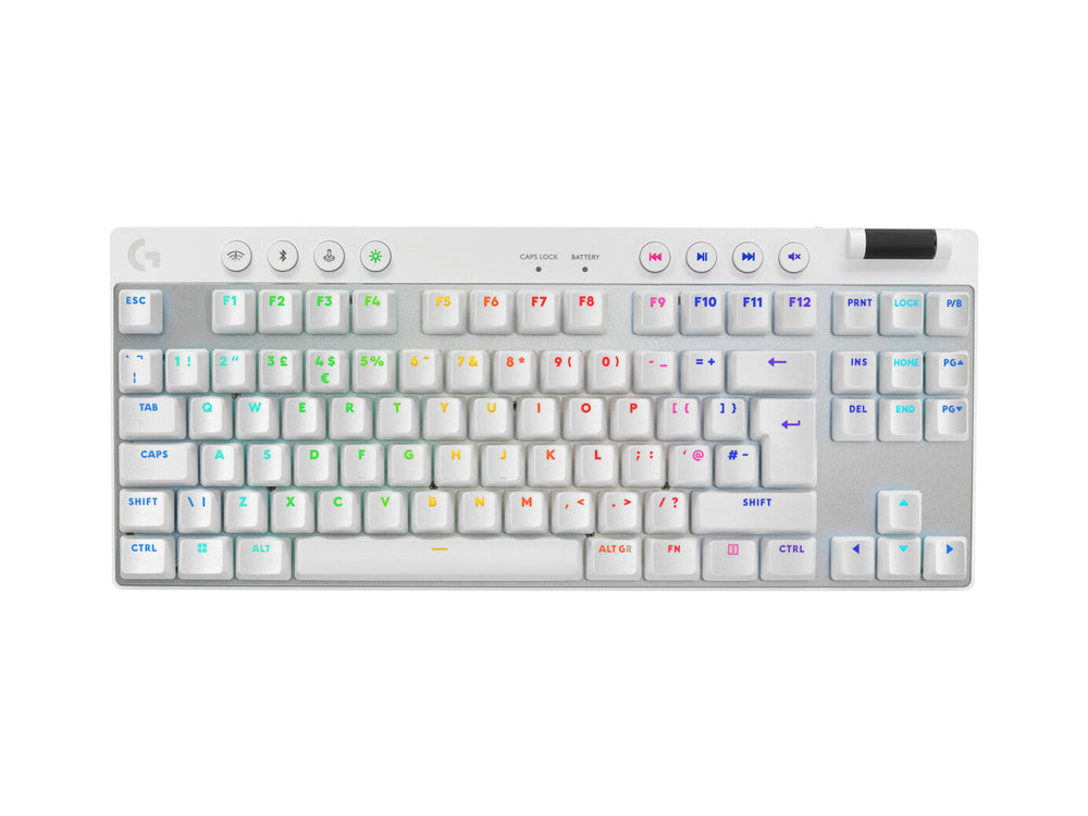 LIGHTSPEED Wireless with upto 50 hrs of battery life. Multiple connection options lightspeed and bluetooth. Keyboard. Key response time (min). 1 ms. Frequency band. 2.4 GHz. Multimedia keys. Yes. Hot keys. Yes. Keyboard key profile. High-profile. Keycaps material. Polybutylene terephthalate (PBT). Numeric keypad. No. Keyboard form factor. Tenkeyless (80 - 87%). Pointing device. No. Keyboard language. UK English. Keyboard layout. QWERTY. Keyboard key switch technology. Logitech Tactile. Keyboard key switch. Mechanical. Device interface. RF Wireless + Bluetooth. Connectivity technology. Wireless. Recommended usage. Gaming. Design. LED indicators. Yes. Surface coloration. Monochromatic. Product colour. White. Adjustable keyboard height. Yes. Keyboard style. Straight. Backlight colour. Multicolour. Backlight type. RGB LED. Backlight. Yes. Features. Detachable cable. Yes. Cable length. 1.83 m. USB connector type. USB Type-A. Wireless range. 10 m. Power. Charging source. USB Type-C. Battery recharge time. 50 h. Battery capacity. 1500 mAh. Keyboard battery type. Built-in battery. Power source type. Battery. Mouse. Mouse included. No. System requirements. Windows operating systems supported. Yes. Weight & dimensions. Keyboard weight. 1.01 kg. Keyboard dimensions (WxDxH). 352 x 150 x 34 mm. Packaging data. Pouch. Yes. Packaging content. User guide. Yes. Adapters included. USB. Cables included. USB Type-A - USB Type-C. Batteries included. Yes. Wireless receiver interface. USB Type-A. Receiver included. Yes. Number of products included. 1 pc(s). Other features. Technology. LIGHTSPEED. Compatibility. PRO X TKL Gaming KeyboardUSB LIGHTSPEED adapterAdapter extensionUSB-A to USB-C charging and data cableCarrying caseUser documentation. manual pdfPRO X TKL | ZERO OPPOSITION | Logitech G