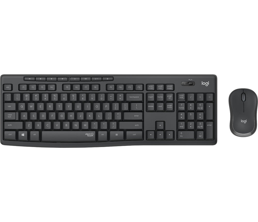 SILENT TOUCH TECHNOLOGY: Logitech MK295 is a wireless keyboard and mouse combo with advanced optical tracking. Get the same typing and clicking feel, with 90% less noise for improved focus. FULL-SIZED COMFORT: The keyboard features a full numpad and 8 handy shortcut buttons for easier navigation and efficient data entry. WIRELESS CONNECTION: Do away with desktop clutter thanks to a lag-free, 2.4GHz wireless connection. The keyboard comes with a 10 m range and USB receiver. PLUG-AND-PLAY: Keep it simple with a streamlined plug-and-play keyboard and mouse combo. Logitech MK295 is compatible with ChromeOS and Windows systems on your laptop or PC computer. DURABLE DESIGN: Spill-resistant, solid layout and durable keys built to last. Sturdy tilt legs give an adjustable height. LONG-LASTING BATTERY: Get months of battery life – including a 36-month keyboard and 18-month mouse – minus the hassle of changing batteries. On/off switches are included to save power. Keyboard. On/off switch. Yes. Silent keys. Yes. Actuation point. 2.4 mm. Frequency band. 2.4 GHz. Actuation force. 57 g. Key travel distance. 3.2 mm. Keyboard keys operating life. 7 million characters. Numeric keypad. Yes. Keyboard form factor. Full-size (100%). Pointing device. No. Keyboard language. Greek. Device interface. RF Wireless. Connectivity technology. Wireless. Design. LED indicators. Yes. Protection features. Spill resistant. Material. Acrylonitrile butadiene styrene (ABS), Rubber. Surface coloration. Monochromatic. Product colour. Graphite. Adjustable keyboard height. Yes. Wrist rest. No. Keyboard style. Straight. Backlight. No. Features. Wireless range. 10 m. Power. Number of batteries supported. 4. Battery type. AA. Service life of battery. 18 month(s). Battery capacity. 2000 mAh. Battery technology. Alkaline. Number of batteries (keyboard). 2. Keyboard battery type. AA. Power source type. Battery. Mouse. Mouse tracking speed. 160 ips. Feet durability. 250 km. Acceleration (max). 30 G. Number of batteries (mouse). 1. Mouse battery type. AA. Scrolling directions. Vertical. Scroll type. Wheel. Scroll. Yes. Buttons type. Pressed buttons. Buttons quantity. 3. Movement resolution. 1000 DPI. Movement detection technology. Optical. Form factor. Ambidextrous. Mouse included. Yes. System requirements. Other operating systems supported. ChromeOS. Windows operating systems supported. Yes. Operational conditions. Storage relative humidity (H-H). 0 - 95%. Operating relative humidity (H-H). 10 - 90%. Storage temperature (T-T). -20 - 50 °C. Operating temperature (T-T). 0 - 40 °C. Weight & dimensions. Mouse weight. 75.2 g. Mouse dimensions (WxDxH). 60 x 39 x 99 mm. Keyboard weight. 498 g. Keyboard dimensions (WxDxH). 441 x 149 x 18 mm. Packaging data. Package type. Box. Package weight. 750 g. Package height. 46 mm. Package depth. 510 mm. Package width. 158 mm. Packaging content. Batteries included. Yes. Receiver weight. 1.8 g. Receiver dimensions (WxDxH). 18.7 x 6.1 x 14.4 mm. Receiver type. Nano receiver. Wireless receiver interface. USB Type-A. Receiver included. Yes. Number of products included. 2 pc(s). Logistics data. Master (outer) case gross weight. 5.17 kg. Master (outer) case height. 289 mm. Master (outer) case length. 517 mm. Master (outer) case width. 166 mm. Harmonized System (HS) code. 84716060. Logitech MK295 Silent Wireless Keyboard and Mouse Combo