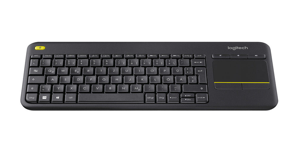 Media-Friendly: The K400 plus wireless touchpad keyboard gives you integrated, comfortable, laid-back control of your PC-to-TV entertainment, eliminating the clutter of a separate keyboard and mouse - all from the comfort of your couch. Plug-and-Play: Works straight out the box, just plug the Unifying mini-receiver into a USB port and the wireless touchpad keyboard is ready to go - then adjust controls using the Logitech Options Software to save your preferred settings. Power-Packed: Built with laid-back control in mind, this wireless keyboard with touchpad has a reliable and long battery life of up to 18 months, including an on-off button to help it go even further. Wireless Freedom: Designed for seamless comfort and control, this tv-keyboard boasts a range of up to 10 m (33 feet) wireless connectivity ensuring uninterrupted use, with quiet keys and a large touchpad for easy navigation. Reliable Durability: The Logitech wireless keyboard with touchpad comes with a 2-Year manufacturer warranty, ensuring worry-free user experience and long-lasting performance. The spill-resistant design and durable keys keep you on-track despite any mishaps.. Broad compatibility: Designed for use with Windows 7, Windows 8, Windows 10 and later, Android 7 or later, and ChromeOS™.. Keyboard. On/off switch. Yes. Noise level. 55 dB. Frequency band. 2.4 GHz. Purpose. PC/Server. Windows keys. Yes. Keyboard keys operating life. 5 million characters. Numeric keypad. No. Pointing device. Touchpad. Keyboard language. German. Keyboard layout. QWERTZ. Device interface. RF Wireless. Connectivity technology. Wireless. Recommended usage. Home. Design. LED indicators. No. Built-in display. No. Surface coloration. Monochromatic. Product colour. Black. Wrist rest. No. Keyboard style. Straight. Backlight. No. Features. Wireless range. 10 m. Power. Number of batteries supported. 2. Battery type. AA. Rechargeable. No. Service life of battery. 18 month(s). Battery capacity. 2000 mAh. Battery technology. Alkaline. Number of batteries (keyboard). 2. Keyboard battery type. AA. Power source type. Battery. Mouse. Mouse battery life. 18 month(s). Mouse battery type. AA. Mouse included. No. System requirements. Other operating systems supported. ChromeOS. Mobile operating systems supported. Android. Windows operating systems supported. Yes. Weight & dimensions. Touchpad height. 7.6 cm. Touchpad width. 4.7 cm. Keyboard weight. 390 g. Keyboard dimensions (WxDxH). 354.3 x 23.5 x 139.9 mm. Packaging data. Package weight. 530 g. Package height. 153 mm. Package depth. 370 mm. Package width. 31 mm. Packaging content. Batteries included. Yes. Receiver weight. 1.8 g. Receiver dimensions (WxDxH). 14.4 x 18.7 x 6.1 mm. Unifying receiver. Yes. Receiver type. Unifying receiver. Wireless receiver interface. USB Type-A. Receiver included. Yes. Number of products included. 1 pc(s). Other features. Internal. No. Logistics data. Master (outer) case gross weight. 5.76 kg. Master (outer) case height. 321 mm. Master (outer) case length. 379 mm. Master (outer) case width. 171 mm. Harmonized System (HS) code. 84716060
