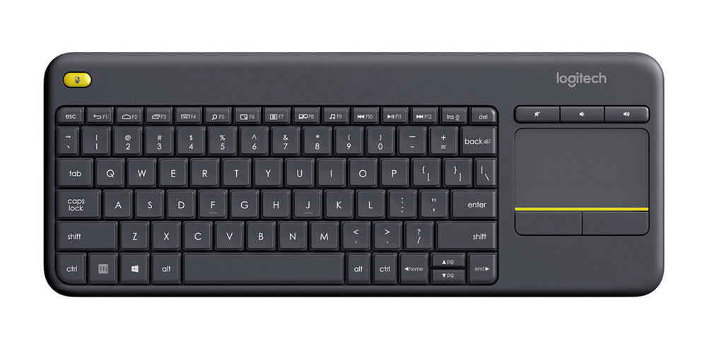 Media-Friendly: The K400 plus wireless touchpad keyboard gives you integrated, comfortable, laid-back control of your PC-to-TV entertainment, eliminating the clutter of a separate keyboard and mouse - all from the comfort of your couch. Plug-and-Play: Works straight out the box, just plug the Unifying mini-receiver into a USB port and the wireless touchpad keyboard is ready to go - then adjust controls using the Logitech Options Software to save your preferred settings. Power-Packed: Built with laid-back control in mind, this wireless keyboard with touchpad has a reliable and long battery life of up to 18 months, including an on-off button to help it go even further. Wireless Freedom: Designed for seamless comfort and control, this tv-keyboard boasts a range of up to 10 m (33 feet) wireless connectivity ensuring uninterrupted use, with quiet keys and a large touchpad for easy navigation. Reliable Durability: The Logitech wireless keyboard with touchpad comes with a 2-Year manufacturer warranty, ensuring worry-free user experience and long-lasting performance. The spill-resistant design and durable keys keep you on-track despite any mishaps.. Broad compatibility: Designed for use with Windows 7, Windows 8, Windows 10 and later, Android 7 or later, and ChromeOS™.. Smart Connector. Smart Connector means there is no need for Bluetooth® pairing or charging. Just set your iPad Pro into a typing position and go. Smart Connector pairs your keyboard and iPad Pro instantly and securely. CREATE also gets its power via the Smart Connector, so you never have to charge the keyboard.. Our best keyboard for iPad. Ever. iPad typing never felt so good. With a truly full-size backlit keyboard CREATE lets you take advantage of the expansive iPad Pro workspace. A special row of dedicated iOS shortcuts puts the power of iOS at your fingertips without ever leaving the keyboard. Get to the home screen, search your iPad and the web, adjust brightness, and control audio or video playback with one click.. Beautiful all-around protection. Careful attention to color, materials and finish means CREATE is both beautiful and protective. Custom-sculpted curves and precision-formed anodized aluminum provide structural integrity to protect your iPad Pro on the inside. On the outside, tightly woven premium fabric resists bumps, scratches, and spills.. Typing and viewing modes. Two different angles make the most of the big, beautiful iPad Pro screen whether you're writing your novel, watching videos, playing games, or using Apple Pencil to take notes.. Auto wake, auto sleep. Open CREATE and your iPad Pro wakes up, ready to rock. Close the case and it's time to sleep, saving battery life for your next inspiration.. Keyboard. On/off switch. Yes. Noise level. 55 dB. Frequency band. 2.4 GHz. Fingerprint reader. No. Purpose. TV. USB hub. No. Keyboard keys operating life. 5 million characters. Numeric keypad. No. Keyboard form factor. Full-size (100%). Pointing device. Touchpad + mouse buttons. Keyboard language. English. Keyboard layout. QWERTY. Device interface. RF Wireless. Connectivity technology. Wireless. Recommended usage. TV. Design. Surface coloration. Monochromatic. Product colour. Black. Wrist rest. No. Keyboard style. Straight. Backlight. No. Features. Plug and Play. Yes. Wireless range. 10 m. Power. Number of batteries supported. 2. Battery type. AA. Battery life (max). 18 h. Battery capacity. 2000 mAh. Battery technology. Alkaline. Number of batteries (keyboard). 2. Keyboard battery type. AA. Power source type. Battery. Mouse. Mouse battery life. 18 month(s). Mouse battery type. AA. Mouse included. No. System requirements. Other operating systems supported. ChromeOS. Mobile operating systems supported. Android. Windows operating systems supported. Yes. Weight & dimensions. Touchpad height. 7.6 cm. Touchpad width. 4.7 cm. Keyboard weight. 390 g. Keyboard dimensions (WxDxH). 354.3 x 23.5 x 139.9 mm. Packaging data. Package weight. 530 g. Package height. 153 mm. Package depth. 370 mm. Package width. 31 mm. Packaging content. User guide. Yes. Batteries included. Yes. Unifying receiver. Yes. Receiver type. Unifying receiver. Receiver included. Yes. Logistics data. Master (outer) case gross weight. 5.76 kg. Master (outer) case height. 321 mm. Master (outer) case length. 379 mm. Master (outer) case width. 171 mm. Harmonized System (HS) code. 84716060. CREATE keyboard with Smart Connector and Backlit keys