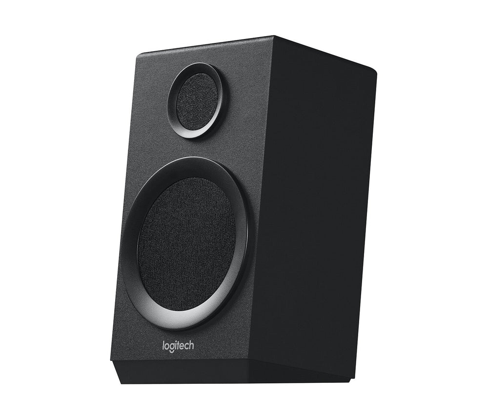 Crank up the sound. With 80 watts of peak power, the Z333 delivers powerful, high-quality acoustics across the full frequency range with a deep bass response. 40 watts of RMS power.. The front-facing subwoofer with a 13-cm (5") driver produces a deep, powerful bass sound that adds another dimension to your music, movies and games.. Easily command your sound with the wired control pod, featuring power switch, volume adjustment and headphone jack.. Adjust the bass to your needs with the separate control knob at the back of the subwoofer.. 3.5 mm and RCA inputs allow you to conveniently connect almost any device with an audio output, such as a computer, tablet, smartphone – or even a TV.. With 80 watts of peak power, the Logitech Z333 Speaker System delivers crisp highs and deep lows that immerses you. Enjoy the bold sound that amazes you whenever you are listening to music, watching your favorite movies or winning honor in your games. Control is simple and integrated. You can easily access power, volume, and the headphone jack on the wired control pod. Adjust the bass level with the dedicated control knob on the back of the subwoofer. Connect either through 3.5 mm or RCA input to enjoy great audio.. Performance. LED indicators. Yes. On/off switch. Yes. Volume control. Rotary. Power cable length. 1.5 m. Remote control type. Wired. Remotely operated. Yes. Product colour. Black. Recommended usage. Universal. Peak Music Power Output (PMPO). 80 W. RMS rated power. 40 W. Audio output channels. 2.1 channels. Amplifier. Amplification device included. No. Satellite speakers. Satellite speaker weight. 600 g. Satellite speaker dimensions (WxDxH). 108 x 90 x 180 mm. Satellite speaker mid-range driver diameter. 7.62 cm (3"). Satellite speakers RMS power. 8 W. Number of satellite speakers. 2. Subwoofer. Subwoofer weight. 2.5 kg. Subwoofer dimensions (W x D x H). 232 x 158 x 230 mm. Bass adjustment. Yes. Subwoofer driver diameter (imperial). 12.7 cm (5"). Subwoofer RMS power. 24 W. Power. Power plug type. Type C. AC input voltage. 100 - 240 V. Power source. AC. AC input frequency. 50 / 60 Hz. Ports & interfaces. Headphone out. Yes. Headphone connectivity. 3.5 mm. Headphone outputs. 1. Bluetooth. No. Connectivity technology. Wired. Packaging data. Package type. Box. Package weight. 4.45 kg. Package height. 217 mm. Package depth. 350 mm. Package width. 235 mm. Other features. Control console dimensions (WxDxH). 55 x 55 x 54 mm. Audio RCA inputs. 1. 3.5 mm (1/8-inch) in. Yes. Control console weight. 72 g. Logistics data. Master (outer) case GTIN (EAN/UPC). 50992060597017. Master (outer) case gross weight. 9.84 kg. Master (outer) case height. 230 mm. Master (outer) case length. 712 mm. Master (outer) case width. 244 mm. Products per pallet. 90 pc(s). Products per intermodal container (40ft, HC). 3300 pc(s). Products per intermodal container (40ft). 3000 pc(s). Products per intermodal container (20ft). 1440 pc(s). Harmonized System (HS) code. 85182200. Technical details. Frequency range. 55 - 20000 Hz. Impedance. 10 Ω. Packaging content. Two satellite speakersSubwooferUser documentation2-year manufacturer's guarantee and full product support.. System requirements. Windows operating systems supported. Windows 10, Windows 11, Windows 7, Windows 8, Windows 8.1, Windows Vista. Mac operating systems supported. Mac OS X 10.10 Yosemite, Mac OS X 10.11 El Capitan, Mac OS X 10.12 Sierra, Mac OS X 10.13 High Sierra, Mac OS X 10.14 Mojave, Mac OS X 10.15 Catalina, Mac OS X 10.15.3 Catalina, Mac OS X 10.3 Panther, Mac OS X 10.4 Tiger, Mac OS X 10.5 Leopard, Mac OS X 10.6 Snow Leopard, Mac OS X 10.7 Lion, Mac OS X 10.8 Mountain Lion, Mac OS X 10.9 Mavericks, Mac OS X 11.0 Big Sur, Mac OS X 12.0 Monterey, Mac OS X 13.0 Ventura. mmo_27232508_1499681708_9814_19528.pdfLogitech z333 set-up instructions