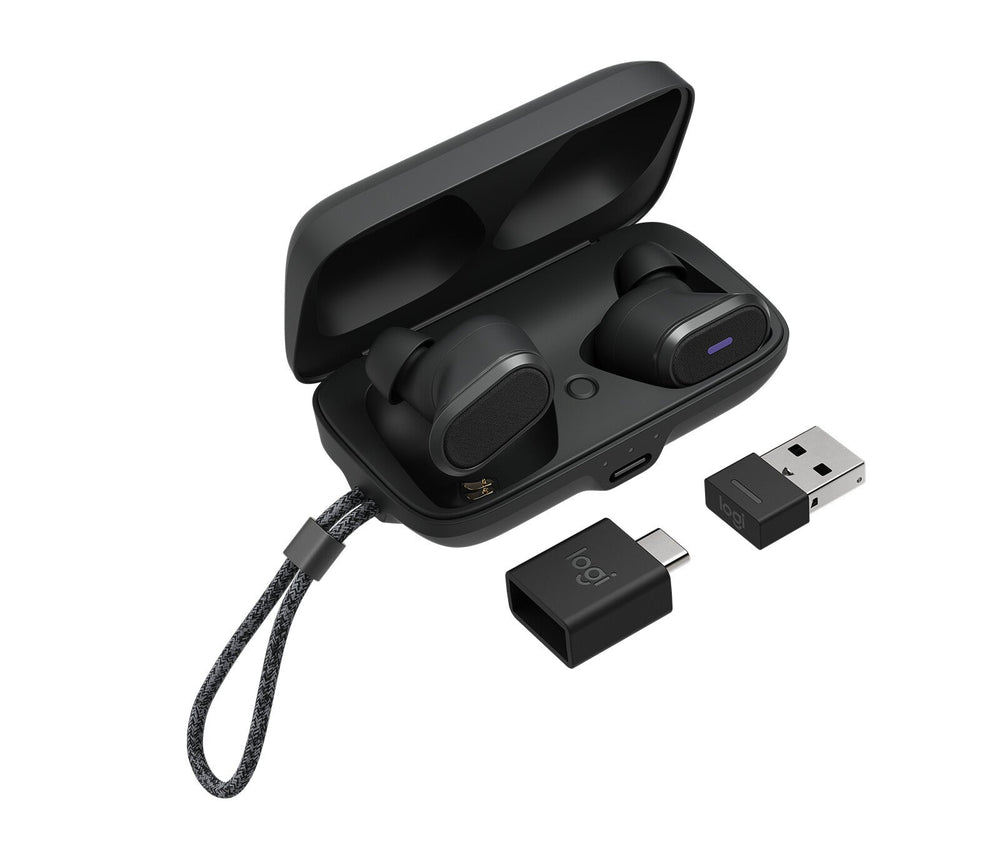 Graphite Calls/Music In-ear Headset. Wireless Bluetooth 5.0 RF connectivity 30 m. Intraaural. Microphone type: Built-in. Built-in battery Lithium-Ion (Li-Ion) 490 mAh. Performance. BeamForming. Yes. International Protection (IP) code. IP68. Control type. Touch. Control unit type. On-ear control unit. Volume control. Touch. Operating keys. Multi-key. Product colour. Graphite. Headset type. Binaural. Recommended usage. Calls/Music. Wearing style. In-ear. Product type. Headset. Ports & interfaces. Wireless range. 30 m. Frequency response (talk mode). 100 - 8000 Hz. Frequency response (music mode). 20 - 20000 Hz. Frequency band. 2.4 GHz. RF connectivity. Yes. Bluetooth version. 5.0. Bluetooth. Yes. Connectivity technology. Wireless. Headphones. Noise canceling type. Active. Driver unit. 1.2 cm. Ear coupling. Intraaural. Microphone. Noise-canceling switch. Yes. Hybrid noise-canceling. Yes. Number of microphones. 2. MEMS (Micro-Electro-Mechanical System) microphone. Yes. Microphone direction type. Omnidirectional. Microphone frequency. 100 - 8000 Hz. Microphone type. Built-in. Battery. Wireless charging. Yes. Number of batteries supported. 1. Talk time (ANC on). 5 h. Talk time (ANC off). 6 h. Fast charging time. 5 min. Fast charging. Yes. Battery recharge time. 2.5 h. Charging source. USB. Battery technology (charging case). Lithium-Ion (Li-Ion). Continuous audio playback time (ANC off). 10 h. Battery capacity (charging case). 490 mAh. Battery recharge time (charging case). 2.5 h. Continuous audio playback time (ANC on). 6 h. Right earpiece battery capacity. 70 mAh. Left earpiece battery capacity. 70 mAh. Battery capacity. 490 mAh. Battery technology. Lithium-Ion (Li-Ion). Battery type. Built-in battery. Battery operated. Yes. System requirements. Mobile operating systems supported. iOS. Mac operating systems supported. MacOS. Windows operating systems supported. Yes. Weight & dimensions. Charging case weight. 46 g. Charging case dimensions (W x D x H). 39.8 x 74.5 x 25 mm. Weight. 13 g. Height. 15.9 mm. Depth. 26.3 mm. Width. 27.4 mm. Packaging data. Package weight. 220 g. Package height. 60.5 mm. Package depth. 137.5 mm. Package width. 96.5 mm. Packaging content. Quantity. 1. Pouch. Yes. Accessories included in set. 3 sizes gel eartips. Cables included. USB Type-A to USB Type-C. Wireless receiver interface. USB Type-A. Receiver included. Yes. Quick start guide. Yes. Charging case connector type. USB Type-C. Charging case type. Wired & Wireless. Charging case. Yes. Logistics data. Master (outer) case gross weight. 1.04 kg. Master (outer) case height. 112 mm. Master (outer) case length. 249 mm. Master (outer) case width. 148 mm. Harmonized System (HS) code. 85183000. Other features. Packaging content. Wireless earbuds with M-sized eargelsWireless charging caseUSB-A receiverUSB-C to A adapterReplaceable eargels (S, L)USB-C to A charging cableTravel bagUser documentation. Interface adapters included. USB Type-A male - USB Type-C female. Receiver dimensions (WxDxH). 13.6 x 6 x 21.5 mm. manual pdf. leaflet. Logitech Zone True Wireless earbuds