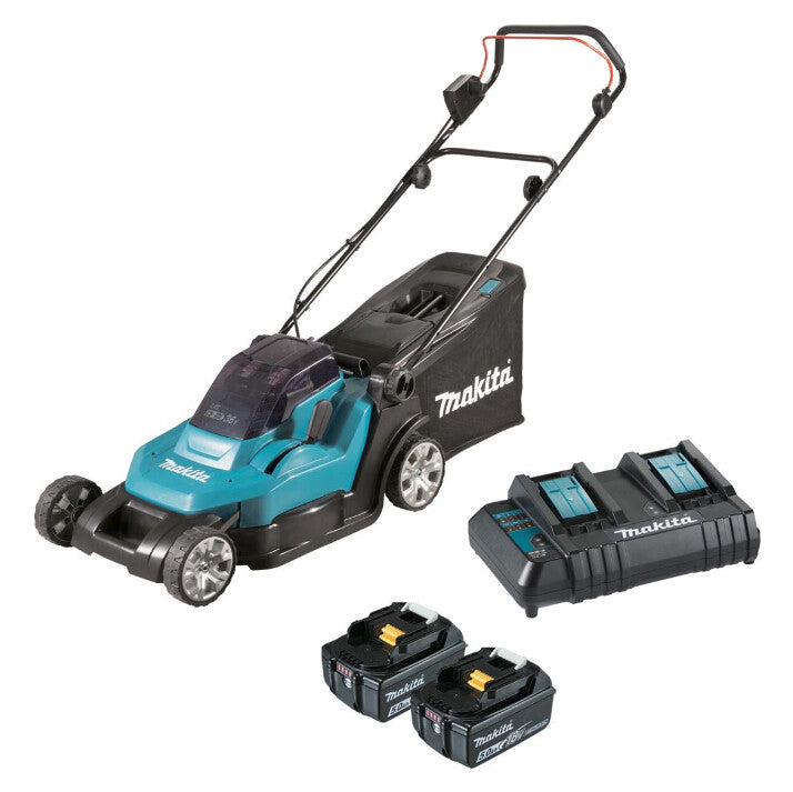 Includes 2 x 5.0Ah batteries & same time dual port standard charger. Ideal for small to medium sized yards. No load speed of 3,600rpm. 13 stage height adjustment. 50L catcher with grass level indicator. Features. Product colour. Black, Blue. Grass collecting volume. 50 L. Grass catcher. Yes. Rotational speed. 3600 RPM. Minimum cutting height. 2 cm. Maximum cutting height. 7.5 cm. Number of height positions. 13. Cutting width. 43 cm. Recommended lawn area. 575 m². Type. Push lawn mower. Power. Battery capacity. 6 Ah. Battery voltage. 36 V. Power source. Battery. Packaging content. Manual. Yes. Weight & dimensions. Weight. 17.5 kg. leaflet. manual pdf. 18Vx2 380mm (15") & 430mm (17") Lawn Mowers