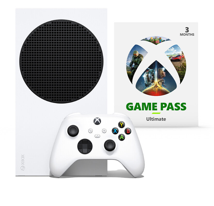 EVERYTHING YOU NEED TO PLAY. Jump into the world of Xbox with the Xbox Series S – Starter Bundle. Includes everything you need to play with a next-gen console and hundreds of high-quality games with 3 months of Game Pass Ultimate.. The best value in gaming. With more dynamic worlds, faster load times and frame rates up to 120FPS, the all-digital Xbox Series S is next-gen performance at a great price.. Xbox Velocity Architecture. The Xbox Velocity Architecture, powered by a custom SSD, works together with the innovative system on a chip (SOC) technology to provide gameplay up to 120FPS.. Quick Resume. Seamlessly move between multiple game titles and resume instantly from where you left off. Expanding game library. Whether you're looking for a day one launch title, one of over a hundred favorites in the Xbox Game Pass library, or any of thousands of backward compatible classics, there is always something to play on the all-digital Xbox Series S.. Complete Control. Share button. You win. Seamlessly capture and share content such as screenshots, recordings, and more with the Share button.. Compatibility. Easily pair and switch. Includes Xbox Wireless and Bluetooth® technology for wireless gaming on console, PC, mobile phones and tablets. Plug in any compatible headset with the 3.5mm stereo headset jack.. Textured triggers. Stay on target. Stay on target with the new hybrid D-pad, textured grip on the triggers, bumpers, and back-case.. Play hundreds of games. Unbox your new console and start playing hundreds of games with 3 months of Game Pass Ultimate included.. Includes:. - Xbox Series S console - 512GB. - Xbox Wireless Controller – Robot White. - 3 months of Game Pass Ultimate. Performance. Product colour. White. Compute units. 20. Graphics processor frequency. 1565 MHz. Graphics processor performance. 4 TFLOPS. Graphics processor. AMD Radeon. Processor model. AMD Ryzen Zen 2. Processor frequency. 3.6 GHz. Processor cores. 8. Processor manufacturer. AMD. Internal memory type. GDDR6. Internal memory. 10240 MB. Platform. Xbox Series S. Storage. Built-in optical drive. No. Internal storage capacity. 512 GB. Storage media. SSD. Network. Networking standards. IEEE 802.3. Bluetooth. No. Wi-Fi standards. Wi-Fi 5 (802.11ac). Wi-Fi. Yes. Ethernet LAN data rates. 10,100,1000 Mbit/s. Ethernet interface type. Gigabit Ethernet. Ethernet LAN. Yes. Ports & interfaces. USB 3.2 Gen 1 (3.1 Gen 1) Type-A ports quantity. 3. HDMI version. 2.1. HDMI ports quantity. 1. Multimedia. High Dynamic Range (HDR) supported. Yes. Supported video modes. 1440p. Logistics data. Country of origin. China. Packaging data. Package width. 292 mm. Package depth. 360 mm. Package height. 275 mm. Package weight. 3.3 kg. Weight & dimensions. Weight. 2.5 kg. Height. 128 mm. Depth. 151 mm. Width. 65 mm. Packaging content. Packaging content. 3 months of Game Pass Ultimate. Cables included. AC, HDMI. Video game included. No. Number of gamepads included. 1. Unboxing the Xbox Series S