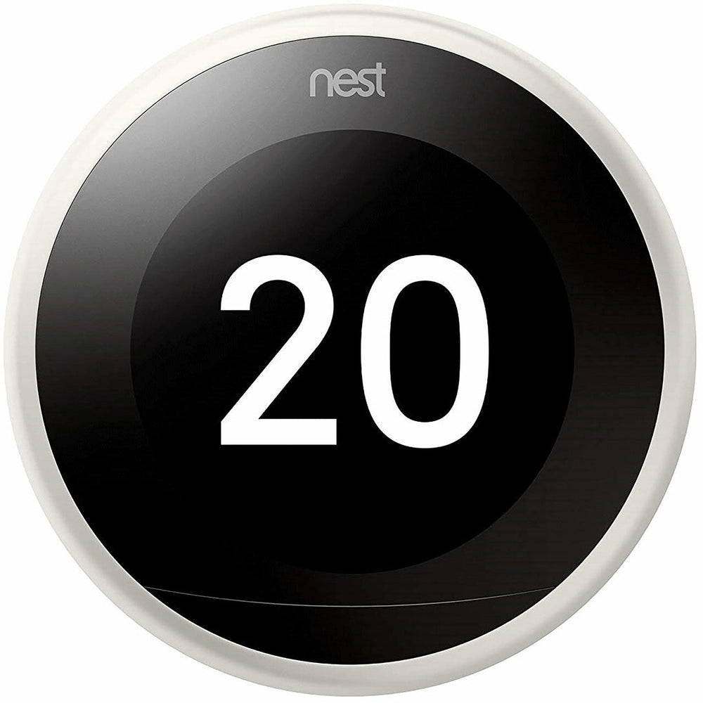 Smart thermostat. WLAN. Wi-Fi Bluetooth Low Energy (BLE). Display: LCD. Power source: Battery. Temperature sensor Humidity sensor. White. Programs itself. Saves energy.. Meet the 3rd-gen Nest Learning Thermostat. It has new rings and a big, sharp display. And hot water control.. Relax, we’ve got you covered.. The Nest Learning Thermostat should be installed by a professional. A Nest Pro will install it in the right location, connect the Heat Link and set it up for you. Nest Stand sold separately.. Your thermostat controls 60% of your energy bill. So shouldn’t it help you save energy?. The Nest thermostat does. Since 2011, we estimate that it’s saved over 39 billion kWh of energy in millions of homes worldwide. Because it learns from you. It gets to know the temperature that you like when you’re at home. And turns itself down when you’re away. It even learns how your home warms up or how draughty it is, so it only uses the energy it needs. That’s how the Nest thermostat saves energy.. Your life with Nest.. The Nest Learning Thermostat automatically adapts as your life changes. Just use it for a week and it programs itself.. Control your hot water.. Now, you can control your hot water tank with the Nest Learning Thermostat. It comes with a hot water schedule — just adjust it from the Nest app. You can boost the heat so that you have extra hot water if you want it. And when you’re away from home for a few days, you don’t have to remember to turn off the hot water. The Nest Learning Thermostat will do it for you.. Follow the Leaf.. Change the temperature to save energy and you’ll be rewarded with a Leaf. The Leaf learns how to help you save, so it appears at different temperatures for different families.. See how much you’ve saved.. Nest shows you how much energy you use every day in Energy History, and every month in your Home Report. So you can see when you use more energy, such as at the weekend or Monday nights, and how to use less.. It lights up when you walk into the room.. Now the Nest Learning Thermostat does something new. It’s called Farsight, and it lights up to show you the temperature, weather or time. You can even choose a digital or analogue clock face. Farsight is big and bright on the beautiful display – you can see it from across the room.. Quick view.. Press the display and turn the ring. You’ll see a summary of what your thermostat is up to and you can reach Settings, Energy History or your schedule.. Control from anywhere.. With the Nest app, your thermostat lives on your wall and in your pocket. Once you connect your thermostat to Wi-Fi, you can control it from anywhere. Adjust the temperature from the app, and the Nest Learning Thermostat adjusts quickly back at home.. Know that your home is safe.. What if it gets so cold that your boiler can’t keep up? Get an alert on your phone if your pipes could burst.. See if Nest will work in your home.. Nest is compatible with most central heating systems.. Features. Multi-Zone capability. Yes. Product colour. White. Bluetooth Low Energy (BLE). Yes. Wi-Fi standards. 802.11a, 802.11b, 802.11g, Wi-Fi 4 (802.11n). Wi-Fi. Yes. Smartphone/tablet remote support. Yes. Interface. WLAN. Smart thermostat. Yes. Display. Display. LCD. Display size (HxV). 53 x 53 mm. Display resolution. 480 x 480 pixels. Pixel density. 229 ppi. Power. Power consumption per month (max). 1 kWh. Battery technology. Lithium-Ion (Li-Ion). Built-in battery. Yes. Power source. Battery. Sensors. Temperature sensor. Yes. Ambient light sensor. Yes. Humidity sensor. Yes. Weight & dimensions. Weight. 243.7 g. Height. 32 mm. Depth. 84 mm. Width. 84 mm. Packaging content. Quantity. 1. Meet the 3rd generation Nest Learning Thermostat