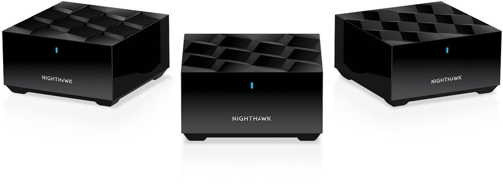 Nighthawk Mesh WiFi 6. Nighthawk. EasyMesh WiFi System. WiFi 6 System. Smart Home WiFi System. Whole Home WiFi System. Your family wants super-fast, reliable WiFi for your whole home, up to 4,500 sq. ft. With the Nighthawk® Mesh WiFi 6 System, experience the future of WiFi with next-generation 802.11ax (WiFi 6). Enjoy dual-band technology designed to handle 4X more connections and the increasing demand for fast gaming without interruption and smooth streaming. The Nighthawk Mesh System comes with two high-power satellites to provide you with broad WiFi coverage, so you can eliminate dead zones by easily adding satellites wherever needed. Set up in minutes and control your home’s WiFi with the Nighthawk App.. Design. Reset button. Yes. Antenna type. Internal. Product colour. Black. Wireless LAN features. Networking standards. IEEE 802.11ax, IEEE 802.11b, IEEE 802.11g, IEEE 802.11n. Wi-Fi standards. 802.11b, 802.11g, Wi-Fi 4 (802.11n), Wi-Fi 6 (802.11ax). Wi-Fi band. Dual-band (2.4 GHz / 5 GHz). Features. Flash memory. 128 MB. Internal memory. 256 MB. Ports & interfaces. DC-in jack. Yes. Certificates. Certification. FCC 15, IECS-003, EN 55032, EN 55035, AS/NZS CISPR. Operational conditions. Operating relative humidity (H-H). 0 - 90%. Operating temperature (T-T). 0 - 40 °C. Weight & dimensions. Weight. 285 g. Height. 50.8 mm. Depth. 101.6 mm. Width. 101.6 mm. Packaging content. AC adapter included. Yes. Packaging data. Package weight. 2.05 kg. Package height. 139 mm. Package depth. 195 mm. Package width. 316 mm. Logistics data. Harmonized System (HS) code. 85176990. Master (outer) case gross weight. 4.94 kg. Master (outer) case length. 329 mm. Master (outer) case height. 317 mm. Master (outer) case width. 292 mm. Products per master (outer) case. 2 pc(s). leafletNETGEAR Nighthawk Mesh WiFi 6