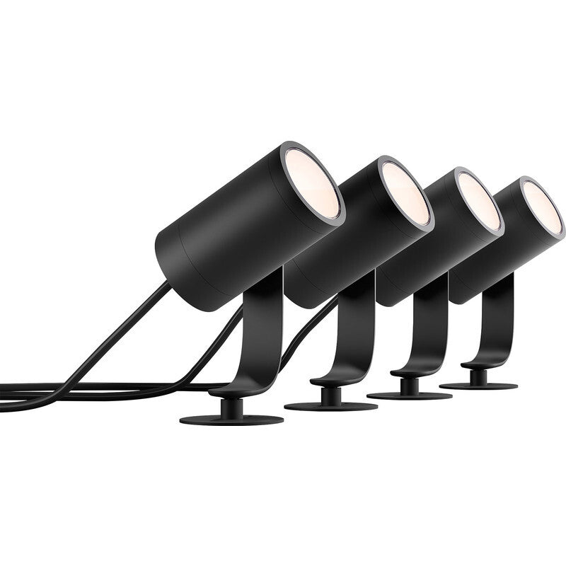 Smart lighting spot Integrated LED 8 W. 2000 K 1770 lm 6500 K. ZigBee. Aluminium. Black. Plug in and light up your outdoor space. This Lily spot light 3-pack lets you highlight your favourite outdoor features, create interesting shadows and more. Simply connect the smart outdoor spotlights into any standard wall socket using the. included low-voltage power supply to get millions of shades of white or coloured light in your garden.. Limitless possibilities. - Paint your outdoors with 16 million colours. - Unwind with warm to cool white light. - Special light for special occasions. Easy control and comfort. - Set timers for your convenience. - Installation-free dimming. - Control it your way. Full control from a smart device with the Hue bridge. - Requires a Philips Hue bridge. Specially designed for your outdoor spaces. - Easy to install and extend. - Power supply and plug included. - Weather-proof (IP65). - High-quality aluminium and superior synthetics. Features. International Protection (IP) code. IP65. Protection class. II. Dimmable. Yes. Bulb power. 8 W. Color Rendering Index (CRI). 80. Luminous flux. 1770 lm. Colour temperature (max). 6500 K. Colour temperature (min). 2000 K. Product colour. Black. Housing material. Aluminium. Bulb type. Integrated LED. Interface. ZigBee. Type. Smart lighting spot. Power. AC input voltage. 220 - 240 V. AC input frequency. 50 - 60 Hz. Input voltage. 220 - 240 V. Energy efficiency class. G. Weight & dimensions. Weight. 3.18 kg. Height. 194 mm. Width. 70 mm. Depth. 84 mm. Cable length. 0.5 m. Packaging data. Package weight. 4.45 kg. Package height. 232 mm. Package depth. 446 mm. Package width. 252 mm. Packaging content. Quantity per pack. 4 pc(s). Technical details. Commodity Classification Automated Tracking System (CCATS). 9405209990. Logistics data. Country of origin. China