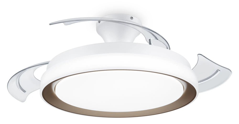 Bright yet comfortable ceiling light. Quiet motor. Retractable ceiling fan with transparent blades. Easy to install, safe to use. Powerful, reliable performance. Get year-round use. Enjoy a comfortable breeze. Convenient timers. Features. LED indicators. No. Shape. Round. Suitable location. Bedroom. Breeze function. Yes. International Protection (IP) code. IP20. Built-in display. No. Humidifier function. No. Timer. No. Number of fan blades. 3. Height adjustment. No. Auto oscillating. No. Fan diameter. 51 cm. Placement. Ceiling. Housing material. Metal. Product colour. Gold. Type. Household blade fan. Power. Input voltage. AC 220–240. AC input voltage. 220–240. Power source type. AC. Lamps. Built-in light. Yes. Bulb type. LED. Bulb(s) included. Yes. Color Rendering Index (CRI). 80. Lighting style. Contemporary. Number of bulbs. 1 bulb(s). Colour temperature (min). 2700 K. Colour temperature (max). 4000 K. Packaging data. Package weight. 7.91 kg. Package height. 285 mm. Package depth. 548 mm. Package width. 548 mm. Remote control included. Yes. Weight & dimensions. Weight. 5.8 kg. Height. 420 mm. Depth. 510 mm. Width. 510 mm. Technical details. Warranty period. 2 year(s). Safety instruction. leaflet