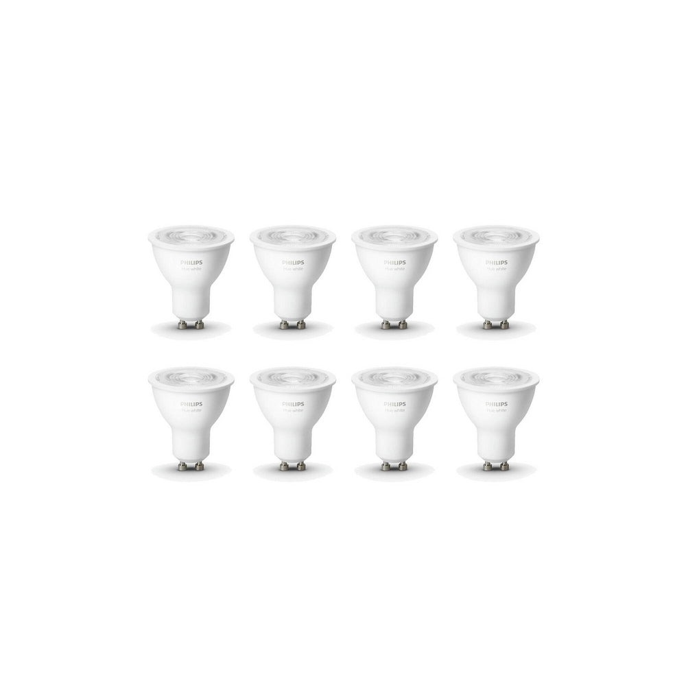 Smart bulb 5 W GU10. Warm white. 2700 K 400 lm. Bluetooth. White. Features. Dimmable. Yes. Suitable for indoor use. Yes. Suitable for light type. Ambience. Equivalent bulb power. 50 W. Bulb power. 5 W. Color Rendering Index (CRI). 80. Luminous flux. 400 lm. Colour temperature (min). 2700 K. Light colour. Warm white. Bulb shape. Spot. Fitting/cap type. GU10. Product colour. White. Interface. Bluetooth. Type. Smart bulb. Performance. Voice control. Yes. Works with the Google Assistant. Yes. Works with Amazon Alexa. Yes. Smartphone/tablet remote support. Yes. Power. Energy efficiency scale. A to G. Energy consumption per 1000 hours. 5 kWh. Energy efficiency class. E. Weight & dimensions. Weight. 100 g. Height. 57 mm. Width. 50 mm. Depth. 50 mm. Packaging data. Package weight. 150 g. Package height. 140 mm. Package depth. 75 mm. Package width. 90 mm. Packaging content. Quantity per pack. 8 pc(s). General. Product family. Hue. Logistics data. Harmonized System (HS) code. 8517620000. Country of origin. China. UK Energy Label. EU Product Fiche