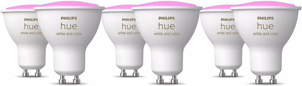±10-year lifespan. Instant wireless dimming. Bluetooth and Hue Bridge compatible. White and color light. 400 lumens. A perfect fit for spotlights, GU10 bulbs give you access to the best of smart lighting. With white and color light as well as ultra-low dimming, these bulbs can help you create immersive experiences, support your routines, and more.. Features. Software upgradeable. Yes. Number of switch cycles. 50000. Deep dimmable. Yes. Dimmable. Yes. Rated lifetime. 25000 h. Bulb lifetime. 25000 h. Bulb power. 4.2 W. Power factor. 0.5. Color Rendering Index (CRI). 80. Luminous flux. 400 lm. Colour temperature (max). 6500 K. Colour temperature (min). 2000 K. Light colour. Multi. Colour changing. Yes. Bulb shape. Spot. Fitting/cap type. GU10. Product colour. White. Interface. Bluetooth/Zigbee. Type. Smart bulb. Performance. Applications supported. Hue app. Applications support. Yes. Voice control. Yes. Works with the Google Assistant. Yes. Works with Amazon Alexa. Yes. Power. Input voltage. 220 - 240 V. Power consumption (standby). 0.25 W. Weight & dimensions. Diameter. 5 cm. Length. 57 mm. Packaging content. Quantity per pack. 6 pc(s). General. Product family. Hue White and colour ambience. Other features. Operating relative humidity (H-H). 5 - 95%. Operating temperature (T-T). -20 - 45 °C