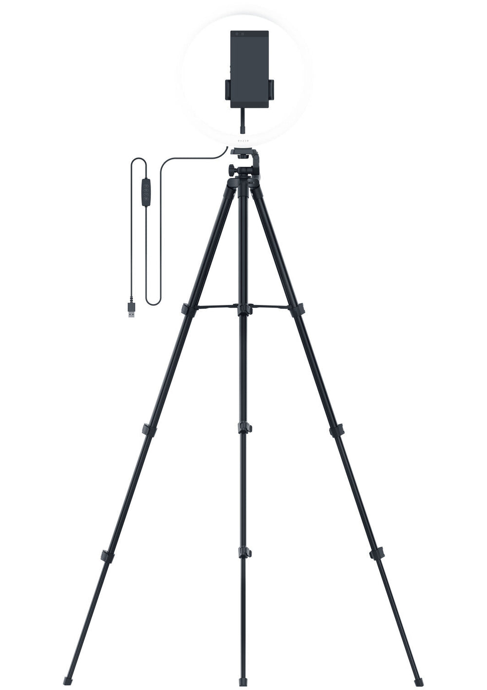 12” ring light. Customizable light spectrum. Adjustable brightness. SEIZE THE SPOTLIGHT. Make every impression your best and elevate your video broadcasting with the Razer Ring Light. Designed for professional PC and mobile streaming, enjoy optimal illumination that brings a studio-like quality to your setup with none of the fuss.. 12” RING LIGHT. The Razer Ring Light is the perfect size for close-ups and houses 192 LEDs for incredible luminous intensity—its light passing through a white diffuser to ensure your stream gets the bright, even lighting found in professional studio settings.. CUSTOMIZABLE LIGHT SPECTRUM. Complement your skin tone and enhance the look and feel of your setup with the flick of a switch, as you choose between a warm white (3000K), balanced white (4500K), or cool white (6500K) tone.. ADJUSTABLE BRIGHTNESS. No matter your room setting or time of day, get the ideal amount of illumination for your stream by controlling the LED ring light’s strength from 10-100%.. FLEXIBLE MOUNTING OPTIONS. The Razer Ring Light comes with a ball head mount for streaming on PC with webcams, compact cams to DSLRs, and a phone holder when streaming on mobile.. TRIPOD STAND. Whether it’s on the tabletop or floor, the Razer Ring Light’s adjustable tripod stand allows for more flexible positioning so you can achieve the best lighting no matter how or where it’s placed.. POWERED THROUGH USB. The LED ring light can be powered by a PC or power bank, which makes it convenient if you need to run a portable streaming setup for events and tournaments.. Features. Product colour. Black. Connecting thread. 1/4". Built-in tripod. Yes. Tripod material. Aluminium. Smartphone holder. Yes. Number of intensity levels. 3. Number of light modes. 3. Colour temperature (max). 6500 K. Colour temperature (min). 3000 K. Colour temperature. 6500 K. Color Rendering Index (CRI). 80. Luminous flux. 500 lm. Material. Metal, Plastic. Bulb technology. LED. Number of LEDs. 192. Power. Energy consumption per 1000 hours. 9 kWh. Energy efficiency scale. A to G. Energy efficiency class. F. Operating current. 2 A. Input voltage. 5 V. Power. 10 W. Power source type. USB. Weight & dimensions. Weight. 1 kg. Outer diameter. 30 cm. Inner diameter. 24.1 cm. Packaging content. Folded length. 40 cm. Tripod length (max). 135 cm. Tripod included. Yes. Packaging data. Package weight. 1.92 kg. Package depth. 102 mm. Package width. 498 mm. Package height. 445 mm. Logistics data. Country of origin. China. Harmonized System (HS) code. 9006990000. EU Energy Label