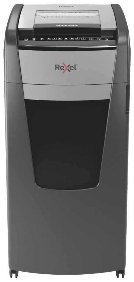 Auto feed up to 600 sheets of A4 paper (80gsm) at a time. Manual slot for up to 15 sheets. P-4 cross cut (4x36mm). 110L high capacity cabinet bin. Plastic shredder bag dispenser inside the bin door for convenient bag replacement. Castor wheels for ease of movement around the workplace. Anti-jam technology. Shreds credit cards, staples and paper clips. 240 minutes continuous run time with fan cooling. Sleep mode activates after 3 minutes of non use. Touch control panel with pin code lock for ultimate confidence and security. 55 dBA ultra-quiet noise level. Infra red bin full sensor. Rexel Optimum AutoFeed+ 600X Automatic Cross Cut Paper Shredder. The Optimum AutoFeed+ 600X cross cut shredder automatically shreds up to 600x A4 sheets of paper (80gsm) at a time, into P-4 (4x36mm) cross cut pieces. This auto feed shredder machine is a sophisticated office shredder, featuring a 110L pull out bin. No need to manually feed paper, or remove staples and paper clips first, this automatic paper shredder will do all the work for you.. Features. Duty cycle. 240 min. ISO A-series sizes (A0...A9). A4. Product colour. Black, Silver. Bin full indicator. Yes. Media weight. 80 g/m². Security level (paper). P-4. Shredding capacity. 600 sheets. Number of wheels. 4 wheel(s). Castor wheels. Yes. Viewing window. Yes. Noise level. 55 dB. Control type. Touch. Basket volume. 110 L. Anti-jam mechanism. Yes. Shredding size. 4x36 mm. Shredding paper clips. Yes. Shredding staples. Yes. Paper shredding. Yes. Credit cards shredding. Yes. Working width. 23 cm. Shredding type. Cross shredding. Weight & dimensions. Weight. 42.5 kg. Height. 1130 mm. Depth. 750 mm. Width. 675 mm. manual pdf