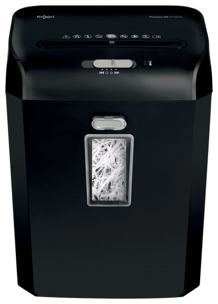Shreds up to 8x A4 sheets (80gsm) at once. P-2 DIN security level (6mm), 1 x A4 sheet into 40 strip cut pieces. 23L bin capacity (160x A4 sheets) with a lift off shredder head. Transparent bin window to see when full. Shreds staples, paper clips and credit cards. 10 minutes continuous run time. Ultra quiet operation < 60 DbA. Manual and auto reverse / forward feature to release paper jams. Overheat LED warning light. Rexel ProMax QS RES823 Strip Cut Paper Shredder. The ProMax QS RES823 shreds up to 8 sheets (80 gsm) at a time in to P-2 (6mm) strip cut pieces, with a 23L bin which holds 160x A4 sheet. Features. Duty cycle. 10 min. ISO A-series sizes (A0...A9). A4. Product colour. Black. Reverse. Yes. Media weight. 80 g/m². Security level (paper). P-2. Shredding capacity. 8 sheets. Viewing window. Yes. Noise level. 60 dB. Basket volume. 23 L. Basket capacity. 160 sheets. Shredding size. 6 mm. Shredding paper clips. Yes. Shredding staples. Yes. Paper shredding. Yes. Credit cards shredding. Yes. Working width. 22 cm. Shredding type. Strip shredding. Weight & dimensions. Weight. 3.81 kg. Height. 460 mm. Depth. 240 mm. Width. 335 mm