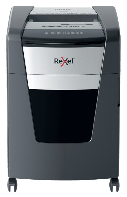 Shreds up to 18x A4 sheets (80 gsm) at once.. P-4 cross cut (4x35mm). Jam-free active sensing technology measures the number of sheets being fed in real-time to stop paper jams and misfeeds; indicated by a red LED on the control panel.. This paper shredder will not operate until the number of sheets is reduced below or at the maximum sheet capacity.. This heavy duty paper shredder also shreds credit cards, staples, paperclips and CD's/DVD's.. 45L capacity bin with cabinet door for easy emptying (400 x A4 sheets).. Continuous run time with fan cooling and ECO mode to save power when not in use.. Touch control panel. 55 dBA ultra-quiet noise level. Infra red bin full sensor. Manual reverse / forward feature. Rexel Momentum Extra jam free paper shredders are ideal for destroying confidential documents in the office. The XP418+ shredder machine shreds up to 18 sheets of A4 paper (80gsm) in one go through the manual feed slot into P-4 (4x35mm) cross cut pieces. Active sensing technology measures the number of sheets being fed in real-time to stop paper jams and misfeeds; indicated by a red LED on the control panel. This paper shredder will not operate until the number of sheets is reduced below or at the maximum sheet capacity. This cross cut shredder is designed for moderate to heavy use with its high sheet capacity, large 45L bin size and continuous run time. There's no need to remove staples and paper clips first; this Rexel shredder also safely shreds CD's, DVD's and credit cards through a separate feed slot.. Features. Product colour. Black. Bin full indicator. Yes. Cut type. Cross cut. Security level (paper). P-4. Shredding capacity. 18 sheets. Number of wheels. 4 wheel(s). Castor wheels. Yes. Viewing window. Yes. Noise level. 55 dB. Control type. Touch. Basket volume. 45 L. Basket capacity. 400 sheets. Pull-out bin. Yes. Shredding size. 4 x 35 mm. Shredding paper clips. Yes. Shredding staples. Yes. Shredding CDs. Yes. Paper shredding. Yes. Credit cards shredding. Yes. Shredding type. Cross shredding. Weight & dimensions. Weight. 28.9 kg. Height. 675 mm. Depth. 479 mm. Width. 445 mm. manual pdfIntroducing: Momentum Extra Paper Shredder