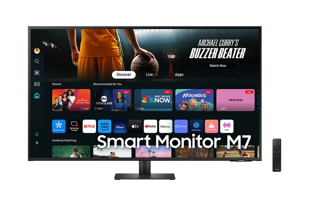 Instant access to your favourite OTT content. Crystal clear video with 4K UHD resolution. USBC, HDMI and USBA ports allow you to connect with convenience. Instant access to your favourite OTT content. Smart TV Apps. Have to make the most out of a small space, or simply want a second TV? The Smart Monitor is the best choice. Stream OTT content directly from the monitor, or tune into Samsung TV Plus to get live TV channels and on-demand content at zero cost.. Enjoy contents in vivid detail. 4K UHD. Crystal clear video. 4K UHD resolution brings your content to life as intended, making worlds feel more real with vivid clarity. Lose yourself while exploring nuanced settings with incredible detail.. Connect with convenience. Multiple Ports. With USB-C, HDMI and USB-A ports, you can connect completely to the Smart Monitor without any adapters. Charge your devices, transmit data and make the most out of your multi-screen setup __ or do all at once __ thanks to the six available ports.. Where gaming comes together. Gaming Hub. Samsung Gaming Hub is the ultimate home for gaming. Instantly play the biggest games from top streaming partners, with no PC or console needed. Discover new games or replay old favorites all in one place.. Solar powered control. SolarCell Remote. The SolarCell Remote, featuring a solar charging panel on its back, eliminates the need for disposable batteries, making it an eco-friendly choice. A newly integrated quick launch button ensures quicker access to specific menu options, including the settings page, for enhanced convenience.. Designed for low vision users. Vision Accessibility Tools. The Smart Monitor is designed with accessibility in mind, particularly for low vision users. It comes equipped with tools that help them see and use the screen more easily, including color switching and audio descriptions for TV settings like the volume and channel.. Simple control for your smart home. SmartThings. See all your smart home devices in a new 3D Map View, for an easier way to manage devices in different rooms. See energy usage and costs by device, and save money by turning on energy saving modes. Use your mobile phone or your voice to tap into the all-in-one IoT hub - all without pausing shows.. "Monitor" your workouts like never before. Workout Tracker. Forget about boring workouts. Stream workout content, or run your own workout while watching contents on the Smart Monitor. Pair your Galaxy Watch to track real-time health data on the screen, while keeping streaming content on at the same time.. Faster, easier access to your work tools. Workspace. Access and control your PC remotely, or work directly on the monitor. Embedded productivity apps like Microsoft 365 let you bypass the PC for a simpler, streamlined working environment.. Switch between screens with one click. Easy Switching Between the Monitor and a PC. Enjoy better control when switching between your PC and Smart Monitor's home screen controls. With the Easy Setting Box software installed on your PC, move between these configurations with one mouse and keyboard. It's full, seamless control of the PC and the monitor's native apps with just one setup.. One mouse and keyboard across devices. Multi Control. Maximize your multitasking capabilities by effortlessly controlling multiple devices with a single mouse and keyboard. Experience greater efficiency with a single control station for your Smart Monitor, Galaxy Tab and Galaxy mobile device.. Display. Colour gamut. 72%. Colour gamut standard. NTSC. High Dynamic Range (HDR) technology. High Dynamic Range 10 (HDR10). High Dynamic Range (HDR) supported. Yes. Display diagonal (metric). 108 cm. Viewable size, vertical. 52.9 cm. Viewable size, horizontal. 94.1 cm. Display number of colours. 1 billion colours. Viewing angle, vertical. 178°. Viewing angle, horizontal. 178°. Maximum refresh rate. 60 Hz. Contrast ratio (typical). 5000:1. Screen shape. Flat. Response time. 4 ms. Display brightness (typical). 300 cd/m². LED backlight. No. Panel type. VA. HD type. 4K Ultra HD. Touchscreen. No. Display technology. LCD. Native aspect ratio. 16:9. Display resolution. 3840 x 2160 pixels. Display diagonal. 109.2 cm (43"). Performance. Operating system installed. Tizen. Game mode. Yes. Game features. Super Ultrawide GameView. Flicker-free technology. Yes. Fast charging. Yes. Multimedia. Adaptive Sound Control (ASC). Yes. Built-in microphone. No. Built-in camera. No. RMS rated power. 20 W. Built-in speaker(s). Yes. Design. Feet colour. Black. Product colour. Black. Market positioning. Smart. Ports & interfaces. Charging port type. USB Type-C. HDCP version. 2.2. HDCP. Yes. HDMI version. 2.0. HDMI ports quantity. 2. HDMI. Yes. USB Power Delivery up to. 65 W. USB Power Delivery (USB PD). Yes. USB hub version. 2.0. Built-in USB hub. Yes. Network. Ethernet LAN. No. Bluetooth version. 5.2. Bluetooth. Yes. Wi-Fi standards. 802.11a, 802.11b, 802.11g, Wi-Fi 4 (802.11n), Wi-Fi 5 (802.11ac). Wi-Fi. Yes. Ergonomics. On Screen Display (OSD). No. Tilt angle range. -2 - 20°. Tilt adjustment. Yes. Height adjustment. No. Cable management. Yes. Wall mountable. Yes. Panel mounting interface. 200 x 200 mm. VESA mounting. Yes. Power. European Product Registry for Energy Labelling (EPREL) code. 1956475. Energy efficiency scale. A to G. Power supply type. Internal. AC input voltage. 100 - 240 V. Power consumption (max). 210 W. Power consumption (standby). 0.5 W. Power consumption (typical). 52 W. Energy consumption (HDR) per 1000 hours. 124 kWh. Energy consumption (SDR) per 1000 hours. 76 kWh. Energy efficiency class (HDR). G. Energy efficiency class (SDR). G. Operational conditions. Operating relative humidity (H-H). 10 - 80%. Operating temperature (T-T). 10 - 40 °C. Weight & dimensions. Weight (without stand). 8.5 kg. Height (without stand). 559.8 mm. Depth (without stand). 25.7 mm. Width (without stand). 965.5 mm. Weight (with stand). 10.6 kg. Height (with stand). 629.3 mm. Depth (with stand). 247.2 