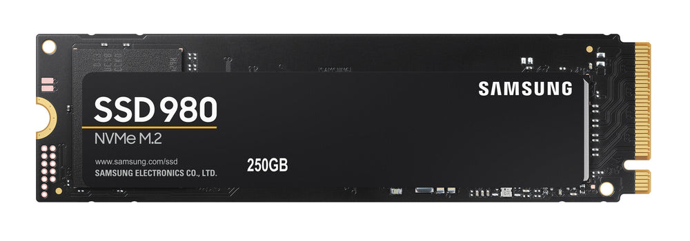 Samsung NVMe SSD powered by V-NAND technology. Up to 3,500 MB/s sequential read and 3,000 MB/s write. Upgrade to breathtaking NVMe™ speed. It's time to maximise your PC's potential with the 980. Whether you need a boost for gaming or a seamless workflow for heavy graphics, the 980 is the smart choice for outstanding SSD performance and it's all backed by an NVMe™ interface and PCIe 3.0 technology.. Packed with speed. Get right to it. The 980 harnesses nearly all the speed advantages of PCIe 3.0 through HMB technology and dramatic NVMe efficiency. The DRAM-less design delivers exceptional value, achieving breakneck sequential read/write speeds up to 3,500/3,000 MB/s[1] , over 6.2x the speed of SATA SSDs.. Keep moving with Full Power Mode. Keep your SSD running at peak level for nonstop, consistent high performance with Full Power Mode. Switch it on through Samsung Magician software to always keep your SSD in active mode. Instantly jump right back to intensive work with huge files, graphics-heavy games or even normal PC usage.. Built for the long run. Keep your files safe with an SSD that's in it for the long haul. With up to 600 TBW and a 5-year limited warranty, the 980's optimised endurance comes with proven reliability thanks to Samsung's in-house solutions, from the state-of-the-art controller to V-NAND and the latest firmware.. Reliable thermal control. High-performance SSDs usually require high-performance thermal control. To ensure stable performance, the 980 uses nickel coating to help manage the controller's heat level and a heat spreader label to deliver effective thermal control of the NAND chip.. Smart thermal solution. Embedded with Samsung's cutting-edge thermal control algorithm, the 980 manages heat on its own to deliver durable and reliable performance. To minimise performance fluctuations in the long haul, Samsung's Dynamic Thermal Guard technology maintains the 980's temperature at optimal levels.. Samsung Magician software. Unlock the full power of the 980 with Samsung Magician's intuitive yet advanced optimisation tools. Monitor drive health, optimise performance, protect valuable data, and receive important updates with Magician to ensure you're always getting the best performance out of your SSD.. World's No. 1 Flash Memory. Experience superior performance and reliability that you can only get from the world's number one brand for flash memory since 2003. All firmware and components, including Samsung's world-renowned DRAM and NAND, are produced in-house, allowing end-to-end integration for quality you can trust.. Features. Mean time between failures (MTBF). 1500000 h. S.M.A.R.T. support. Yes. PCI Express interface data lanes. x4. Controller type. Samsung Pablo. Random write (4KB). 320000 IOPS. Random read (4KB). 230000 IOPS. Write speed. 2900 MB/s. Read speed. 1300 MB/s. M.2 SSD size. 2280 (22 x 80 mm). Security algorithms. 256-bit AES. Hardware encryption. Yes. Component for. PC/Laptop. Memory type. V-NAND. NVMe version. 1.4. NVMe. Yes. Interface. PCI Express 3.0. SSD form factor. M.2. SSD capacity. 250 GB. Power. Power consumption (average). 3.7 W. Power consumption (max). 5.6 W. Operating voltage. 3.3 V. Weight & dimensions. Weight. 8 g. Height. 2.38 mm. Depth. 22.1 mm. Width. 80.2 mm. Operational conditions. Operating vibration. 1500 G. Operating temperature (T-T). 0 - 70 °C. Logistics data. Harmonized System (HS) code. 84717070. leaflet