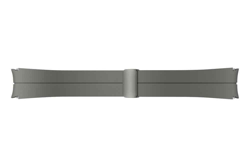 Rubber watch band with magnetic metal buckle. Works with Galaxy4/5/6/7/FE/4 Classic/6 Classic/5 Pro. Timeless design for your timepiece. This sleek, D-buckle design is magnetic, making it simple to clasp on or take off. It's got style with a clean and minimalist silhouette and has also been designed for wide compatibility. Add it to your Galaxy Watch upgrade, or buy it later to update the look of your Galaxy Watch.. Clasp on seriously smooth comfort. Smooth yet strong, this band is made of sweat-resistant and comfortable fluoroelastomer material that's more flexible than previous models. It's designed to install easily on the handles of newer Galaxy Watch models, and you can adjust the angle as you like with the added air pocket for flexibility.. Features. Easy to install. Yes. Buckle colour. Grey. Buckle material. Metal. Material. Fluoroelastomer. Watch part/accessory type. Watch strap