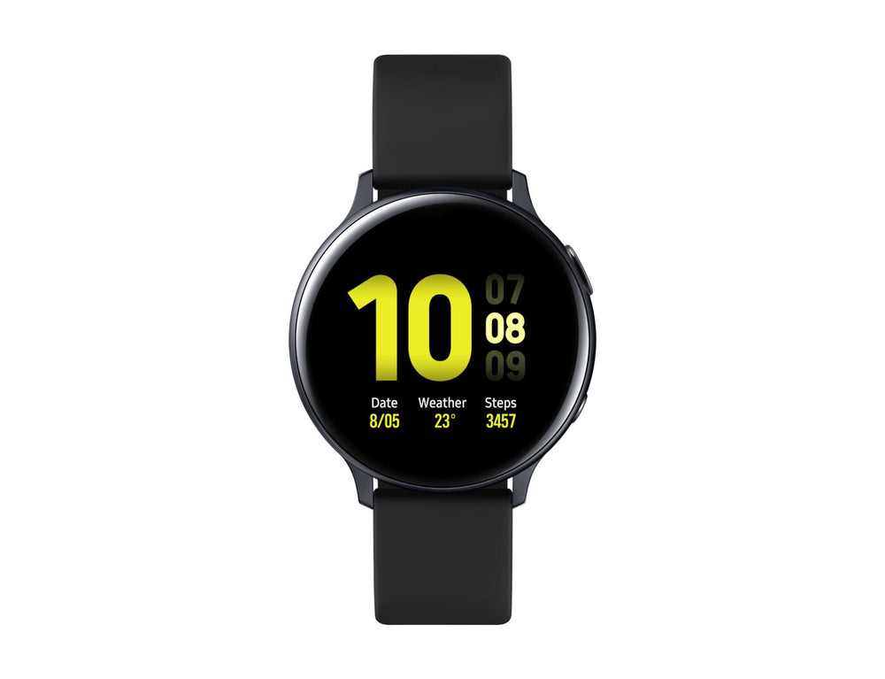 Galaxy Watch Active2. Track your workout on your wrist. Healthy living starts with a clear mind. A friendly reminder to wash your hands. Measure blood pressure on the move. Track your heart's rhythm with ECG. IP68 and 5ATM water. LTE-powered newly available in Aluminum. Tizen Based Wearable OS 4.0. The all-new Galaxy Watch Active2 now comes with a bigger customizable screen and fresh new look. It gives you precise health insights when you need it, while keeping you fully connected. Whether you are out for a run, or pushing through your next deadline the Galaxy Watch Active2 will keep you at your optimal performance inside and out.. Custom comfort on your wrist. Choose your look and your comfort for a wellness partner you’ll want to keep on 24/7.. Galaxy Watch Active2 comes customized from day one, starting with your choice of Bluetooth or LTE model, 44mm or 40mm, stainless steel or lightweight aluminum design, and straps galore. Widen your space. Maximize your screen space with an uninterrupted view on a sleek body fitted with a touch bezel for quick control.. Galaxy Watch Active2 features an enlarged display with a pure black screen and a border. that's hardly there for more space to get the insight you need.. Snap your outfit and grab your look. Express yourself with a watch face that fits your look and mood. When you snap a picture of your outfit for the day Galaxy Watch Active2 will put together a watch face to match.. Match your strap in a flash. Complement your style with a watch face that matches the color and material of your strap. When you buy a watch strap and scan the QR code on the package you'll get a link to Galaxy Store to download a watch face that fits it.. A watch to make your own. Mix and match for a watch design that fits your look. Choose from the wide selection of straps and put together your own custom Galaxy Watch Active2.. Track your workout on your wrist. Galaxy Watch Active2 tracks your movements so you can just slip it on and get working out. With swimming added to automatic tracking you now get seven exercises, while manual tracking works for all activities for dozens you can track. Running coach function gives you actionable advice in real time.. Health support from the inside out. Be sound in body and mind with a watch that cares for both. Use the stress tracker to watch your stress levels when you're feeling tense, and follow the suggested guided breathing exercises to get some peace of mind.. Heart rate tracking for peace of mind. Monitoring your health is at the core of Galaxy Watch Active2 with a full eight photodiodes on the rear side of a new curved design that moulds to your wrist. Health monitoring keeps an eye on your heart rate and sends you an alert when it goes above or below normal levels.. Give your life an assist. Get a jump on life with a smart assistant on your wrist. Control your camera to enrich the shooting experience, view and like on social media, and translate on the go. Newly added On-going Icon displays running apps on the watch face for easy access, and you can even catch incoming calls with Wi-Fi. Stay connected without your phone. Take your contacts, messages and music with you on an LTE-powered life assistant that lets you leave your phone behind. Go on a run with the peace of mind of being connected and not weighed down. Keep your music streaming as you go or download ahead of time for areas with low connectivity.. More to move you. Enhance the fitness experience with the exclusive Galaxy Watch Active2 Under Armour Edition. 6 months' MapMyRun MVP service and limited UA watch face get you off on the right foot. Form and fitness coaching gives you real-time feedback based on cadence data and more.. Power thats the day. Take your Galaxy Watch Active2 out for the day with a battery that lasts the day and more with normal use. Back home, just lay it on the compact magnetic wireless charger to bring it back to full, no charging jacks or wires required.. Keeps up where you go. Take your watch along on the road less traveled. Galaxy Watch Active2 goes where you go with an IP68 and 5ATM water and dust rating plus military grade durability to handle a range of conditions, so you can keep it on to go farther and experience more.. Apps to push you further. Bring enhancement to your life with apps ranging from the Galaxy lineup to a large variety of downloadable 3rd party apps.. Download apps to create your own personal lineup for smart advice on the fly that you can pull up without leaving your wrist. Get connected to your device. Wide compatibility with both Galaxy and non-Galaxy smartphones. Get started by seeing which devices are compatible with Galaxy Watch Active2.. Display. Watch glass type. Corning Gorilla Glass DX+. Display diagonal. 3.43 cm (1.35"). Display technology. OLED. Display technology marketing name. Super AMOLED. Touchscreen. Yes. Display resolution. 360 x 360 pixels. Display type. Digital. Performance. Processor cores. 2. Processor frequency. 1150 MHz. Processor model. Exynos 9110. Processor manufacturer. Exynos. Flash memory. 4 GB. RAM capacity. 768 MB. Compatible memory cards. Not supported. Operating system installed. Tizen Based Wearable OS 4.0. Mobile operating systems supported. Android 5.0, Android 5.1, Android 6.0, Android 7.0, Android 7.1, Android 7.1.2, Android 8.0, Android 9.0, iOS 9.0, iOS 9.1, iOS 9.2, iOS 9.3. FM radio. No. Built-in camera. No. Built-in speaker(s). Yes. Built-in microphone. Yes. Design. Waterproof up to. 50 m. Protection features. Waterproof. Removable strap. Yes. International Protection (IP) code. IP68. Maximum strap length. 21 cm. Shape. Round. Wrist size range. 140 - 210 mm. Band size. M/L. Band material. Fluoroelastomer. Band colour. Black. Watch case material. Aluminium. Watch case colour. Black. Watch case size. 44 mm. Market positioning. Smartwatch. Features. Military standard. MIL-STD-810G. Barometer. Yes. Audio formats supported. 3GA, AAC, AMR, AWB, M4A, MP3, OGA, OGG, WAV, WM