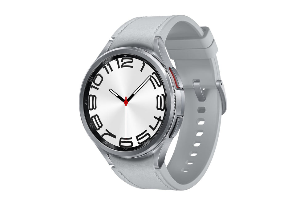 Smooth, intuitive scrolling. Any way you spin it. Track your workouts to maximize results. Understand your habits to improve your sleep. More screen. Thinner bezel. Experience enhanced visuals and clear motion graphics on a 30% larger display. The 15% thinner bezel and increased screen size create an aesthetically perfect display-to-bezel ratio — and extra space for every tap and swipe.. Sapphire Crystal glass. A clear difference in durability. Designed to withstand daily wear and tear. The display of Galaxy Watch6 Classic is expertly crafted with Sapphire Crystal glass to protect its timeless beauty. And the finishing has IP68 and 5ATM ratings, so you can keep your watch on through all your adventures.. Go from boardroom to weight room in a snap. Swapping bands is as seamless as pressing the quick release button. A convenient guide lets you install the new band with ease — just press gently until you hear a click. Transition from work to workout or back again without breaking a sweat.. More processing power to do more with every minute. Get more done in less time with Galaxy Watch6 Classic's upgraded processor. The 18% faster CPU speed and quick app launch time keep you productive and efficient throughout the day.. Charge up in record time. With one full charge, the watch lasts up to 40 hours. Fast charge the watch to 45% in just 30 minutes and you're all set to explore the great outdoors or enjoy a well-deserved break in bed.. Hands-on shooting, hands-free. Pair your watch with Galaxy Z Fold5 to capture the healthy you up close or from a distance. Galaxy Z Fold5's Flex mode and Camera Controller let you easily switch between photo and video mode, or zoom in and out, all from the comfort of your wrist. Then tap the shutter button on your watch to take a pic.. Samsung Wallet is always on hand. Access Samsung Wallet right from your Galaxy Watch6 Classic. Make payments, ride public transit, scan membership cards and more. You can even store non-payment items like digital IDs, tickets and keys, to lighten your load and empty out your pockets.. Wake up to our most advanced sleep tracking. Get detailed sleep tracking with improved analysis and deeper insights to enhance the quality of your sleep. And now you can access Sleep Coaching on your Galaxy Watch6 Classic to build better sleeping habits. Get a good night's sleep when wearing your watch to bed by switching to the Fabric Band. Be sure to put your watch on sleep mode to change the PPG sensor's green LED to invisible infrared LED, dim the display brightness and mute notifications.. Be prepared with Cycle Tracking. Get in tune with your health and body. Cycle Tracking powered by Natural Cycles˚ uses your nightly skin temperature from your watch, measured while you sleep, to predict the dates of your period and other cycles. Plan ahead and live life to the fullest with Galaxy Watch6.. A heart monitoring package that watches over you. Lessen your worries with a heart monitoring package that brings you peace of mind, so you can focus on your day. The built-in PPG sensor periodically measures heart rate and heart rhythm while you wear your Galaxy Watch6, and will alert you if your heart rate is too high or too low. It will also send you a notification if it detects an irregular heart rhythm, along with a prompt to take an ECG to examine your heart rhythm in more detail.. Keep a watchful eye on your blood pressure. Stay informed and stay healthy. Let the watch take charge in measuring and tracking your daily blood pressure so you can focus on making sound choices for a balanced lifestyle.. Clock your goals with BIA. Keep an eye on your body composition with detailed Bioelectrical Impedance Analysis (BIA). Set your target weight, body fat, muscle mass and more, then set up an optimized program to help you achieve your health and wellness goals.. Meet your Personlized HR Zone. Your watch can assess your fitness capacity to determine your personal HR Zone. If there's a specific HR zone you want to hit, you can set the goal manually. As you workout you'll be alerted when you enter your target HR Zone, whether that's fat burning, cardio or high-intensity training. Move out of the zone, and it'll alert you too — letting you adjust your effort accordingly.. Exercise tracking - Chart your growth to peak performance. Gain valuable insights into your progress and achievements with Galaxy Watch6 Classic. Track over 90 different workouts, or you can even create your own custom workout, to log your daily activity and monitor your progress. You can activate auto detect for select workouts like running, walking, and now, cycling to go straight from warm up mode to beast mode.. Change plans? Change bands. Change faces. Create your own bespoke look for Galaxy Watch6 Classic. Choose from a wide collection of bands to take your look from rugged to classy, depending on your mood. Customize your watch face with a sleek design or complications to quickly access your favorite apps.. Display. Watch glass type. Sapphire. Display number of colours. 16 million colours. Always-on display. Yes. Colour display. Yes. Pixel density. 330 ppi. Display brightness. 600 cd/m². Display diagonal. 3.81 cm (1.5"). Display technology. OLED. Display technology marketing name. Super AMOLED. Touchscreen. Yes. Display resolution. 480 x 480 pixels. Display type. Digital. Performance. Processor cores. 2. Processor frequency. 1.4 MHz. Processor manufacturer. Samsung. Flash memory. 16 GB. RAM capacity. 2000 MB. Operating system installed. Wear OS. Mobile operating systems supported. Android 10.0, Android 11.0, Android 12.0, Android 13.0. Built-in camera. No. Built-in speaker(s). Yes. Built-in microphone. Yes. Design. Water resistance. 5 ATM. Protection features. Water resistant. International Protection (IP) code. IP68. Shape. Round. Band colour. Silver. Watch case material. Stainless steel. Watch case colour. Silver. Watch case size. 47 mm. Market positioning. Smartwatch. Features. Mi
