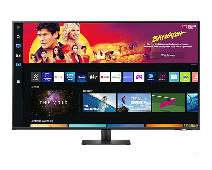 Enjoy a smart TV experience with just a monitor and its embedded TV apps. Effortlessly work on documents, video conference, and access files wirelessly from PCs. Easily control in-home IoT devices with just a monitor. Watch, play and live in style. Everything you need is right on your screen. Watch, work and chat - all without connecting a separate PC - with Smart Monitor. Your favourite content, productivity and video call apps are built-in for a simpler and stylish desk setup that’s a joy to use every time.. Your favourite shows in your space. Smart TV Experience. Enjoy effortless entertainment. Get Netflix, YouTube and other streaming services by simply connecting the monitor to WiFi. Samsung TV Plus also offers free live and on-demand content with no downloads or sign-up needed, while Universal Guide provides personalised content recommendations.. PC-less productivity. Workspace. Experience PC-less. Browse the web, edit documents and work on projects, all without the need for a separate PC. With new Workmode, you can also remotely access another PC, use Microsoft 365 programs and even connect to Samsung mobile devices with Samsung DeX for seamless working.. Say hey to your pals. SlimFit camera. Jump into any conversation. The SlimFit camera with tilt functionality allows you to create the perfect angle while using your favorite video call apps like Google Duo, which can be accessed directly through the monitor. Plus, the camera cover and option to fully detach always protect your privacy.. * Camera accessory should be purchased seperately. Hub for your home, from any room. IoT Hub. Turn your Smart Monitor into a control center for the home by connecting it to your IoT home products with SmartThings. Relax by turning off the lights, pulling down the blinds and setting the thermostat to the perfect temperature all with the Smart Monitor for a perfectly relaxed evening.. Just say what you want. Multiple Voice Assistants. With the Far Field Voice feature, activate your voice assistant just by speaking. Directly command the monitor – even at a distance – and tell it what you need. It’s as simple as that. The Smart Monitor supports both Bixby and Amazon Alexa.. * Amazon, Alexa and all related marks are trademarks of Amazon.com, Inc. or its affiliates.* Bixby voice commands recognize English (US/UK/IN), French, Spanish, German, Italian, Portuguese(BR), Chinese (in China mainland only) and Korean. Content on the big screen made easy. Mobile connectivity. Convenient connectivity. With AirPlay integration, you can wirelessly connect Apple devices to the Smart Monitor and view on a bigger screen. Enjoy your favourite content from an iPhone, iPad, and Mac on the Smart Monitor and even mirror apps, documents, and websites.. Enjoy Contents in vivid detail. UHD. Astonishing picture quality for work and play. With 4x the pixels of Full HD, the Smart Monitor delivers more screen space and amazingly life-like UHD images. By day, see more documents at once. And, in the evening, watch movies in cinematic 4K quality.. Optimal brightness, optimum enjoyment. Adaptive Picture. Sensational picture, day or night. Surrounding light is detected by a sensor to adjust brightness automatically with Adaptive Picture. Even in broad daylight, watch dark, gritty dramas without squinting and straining your eyes to see the picture.. Rich sound, real experiences. Adaptive Sound. With built-in speakers, the M7 provides rich and realistic sounds for a more immersive experience overall. Plus, the Adaptive Sound feature adjusts sound based on a range of content situations, from speech to music to ambient noise, delivering more refined and enjoyable sounds for every listener.. Connect with convenience. USB type-C. The USB type-C port enables you to power up, transmit data, and even send display signals between devices with just one connection. Its single connection architecture brings an enjoyable work environment that's both clutter-free and stress-free.. Reveal the game's hidden sides. Ultrawide Game View. Keep your eye on the win. Adjust your screen to 21:9 to discover hidden areas in game scenes with Ultrawide Game View. Now when you play football games, see more of the pitch right up to the goalposts. And in driving games, get a natural and encompassing view of the road ahead.. * Availability limited to source devices which support 21:9 output.* May function differently depending on game or content being viewed.. Plug and see. Auto Source Switch +. No more switching around. With Automatic Source Switch Plus, your monitor detects newly connected devices as soon they're plugged in, and displays the correct signal. No more searching for the right input on the menu.. Display. High Dynamic Range (HDR) technology. High Dynamic Range 10 (HDR10). High Dynamic Range (HDR) supported. Yes. Display number of colours. 1.07 billion colours. Viewing angle, vertical. 178°. Viewing angle, horizontal. 178°. Maximum refresh rate. 60 Hz. Contrast ratio (typical). 3000:1. Screen shape. Flat. Response time. 4 ms. Display brightness (typical). 300 cd/m². Panel type. VA. HD type. 4K Ultra HD. Touchscreen. No. Native aspect ratio. 16:9. Display resolution. 3840 x 2160 pixels. Display diagonal. 109.2 cm (43"). Performance. Operating system installed. Tizen. Game mode. Yes. Flicker-free technology. Yes. ConnectShare (USB). Yes. Design. Colour name. Black. Product colour. Black. Market positioning. Home. Ports & interfaces. HDMI version. 2.0. HDMI ports quantity. 2. HDMI. Yes. USB Power Delivery up to. 65 W. USB Power Delivery (USB PD). Yes. USB Type-C downstream ports quantity. 1. USB hub version. 2.0. Built-in USB hub. Yes. Network. Bluetooth version. 4.2. Bluetooth. Yes. Wi-Fi standards. Wi-Fi 5 (802.11ac). Wi-Fi. Yes. Ergonomics. Tilt angle range. -2 - 22°. Tilt adjustment. Yes. Panel mounting interface. 100 x 100 mm. VESA mounting. Yes. Power. European Product Registry for Energy Labelling (EPREL) code. 1114569. AC input voltage. 1
