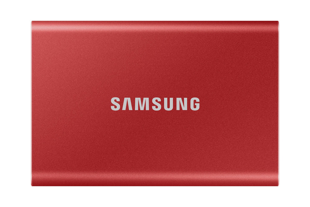 Up to 9.5 times faster than an external HDD with transfer speeds of up to 1,050MB/s.. USB 3.2 Gen 2 (up to 10 Gbps). Backwards compatible.. Compatible with Windows®, macOS®, Android™ phones and tablets, gaming consoles and cameras.. Peace of mind with up to 2 meters drop resistance and a 3-year limited warranty.. Includes USB Type-C-to-C and USB Type-C-to-A cables.. Transfer in a flash. Featuring sequential read/write speeds of up to 1,050 MB/s and 1,000 MB/s, the T7 can transfer massive files in mere seconds via its USB 3.2 Gen 2 interface to give your workflow a much-needed boost.. Compact design with colossal capacity. Store it all on a credit card-size drive with capacity from 1TB to 4TB in choice of blue or grey.. Compatible with multiple devices. Bundled with USB Type C-to-C and Type C-to-A cables for added convenience, the T7 minimises disruption, letting users switch seamlessly between Windows®, macOS®, smartphones, tablets or game consoles.. Capture longer, save instantly. Prolong your smartphone filmmaking with T7's excellent power efficiency. Capture and store 4K smartphone filming data simultaneously with T7. Enable instant editing with effortless T7 connection to your laptop or PC.. Sophisticated thermal solution. Use T7 without worrying about overheating. The T7's advanced thermal solution uses the Dynamic Thermal Guard to withstand and control heat, so the compact SSD stays at an optimal temperature even at fast speeds.. Built strong and secure. The T7 can be secured with an AES 256-bit encrypted password and is encased in a sturdy metal body that keeps data intact from falls of up to 2 meters. The T7 is confidently backed by a 3-year limited warranty.. Samsung Magician software. Unlock the full power of T7 with Samsung Magician software - a user-friendly suite of optimisation tools that facilitate the best portable SSD performance. Protect valuable data, monitor drive health, and get the latest firmware updates.. Bringing innovations to life. For decades, Samsungs NAND flash memory has powered groundbreaking technologies that have changed every part of our daily lives. This NAND flash technology also powers our consumer SSDs, making room for the next big push of innovation.. Lightning-fast transfer speeds. With up to 1,050 MB/s transfer speed, the T7 puts you full speed ahead at work or play.. Extensive compatibility. Freely switch between devices during your workflow without disruption.. Sleek and compact style. Effortlessly transfer vast data with the light and compact T7.. Solid state drive. Write speed. 1000 MB/s. Read speed. 1050 MB/s. NVMe. Yes. SSD capacity. 500 GB. Ports & interfaces. Wi-Fi. No. USB version. 3.2 Gen 2 (3.1 Gen 2). USB connector. USB Type-C. Features. Certification. CE, BSMI, KC, VCCI, C-tick, FCC, IC, UL, TUV, CB, EAC. Country of origin. South Korea. Compliance certificates. RoHS. Mac operating systems supported. Yes. Windows operating systems supported. Yes. Housing material. Aluminium. Product colour. Red. Security. Password protection. Yes. Hardware encryption. Yes. Weight & dimensions. Weight. 58 g. Height. 57 mm. Depth. 8 mm. Width. 85 mm. Packaging data. Package type. Box. Package weight. 77 g. Package height. 50 mm. Package depth. 125 mm. Package width. 100 mm. Logistics data. Harmonized System (HS) code. 84717070